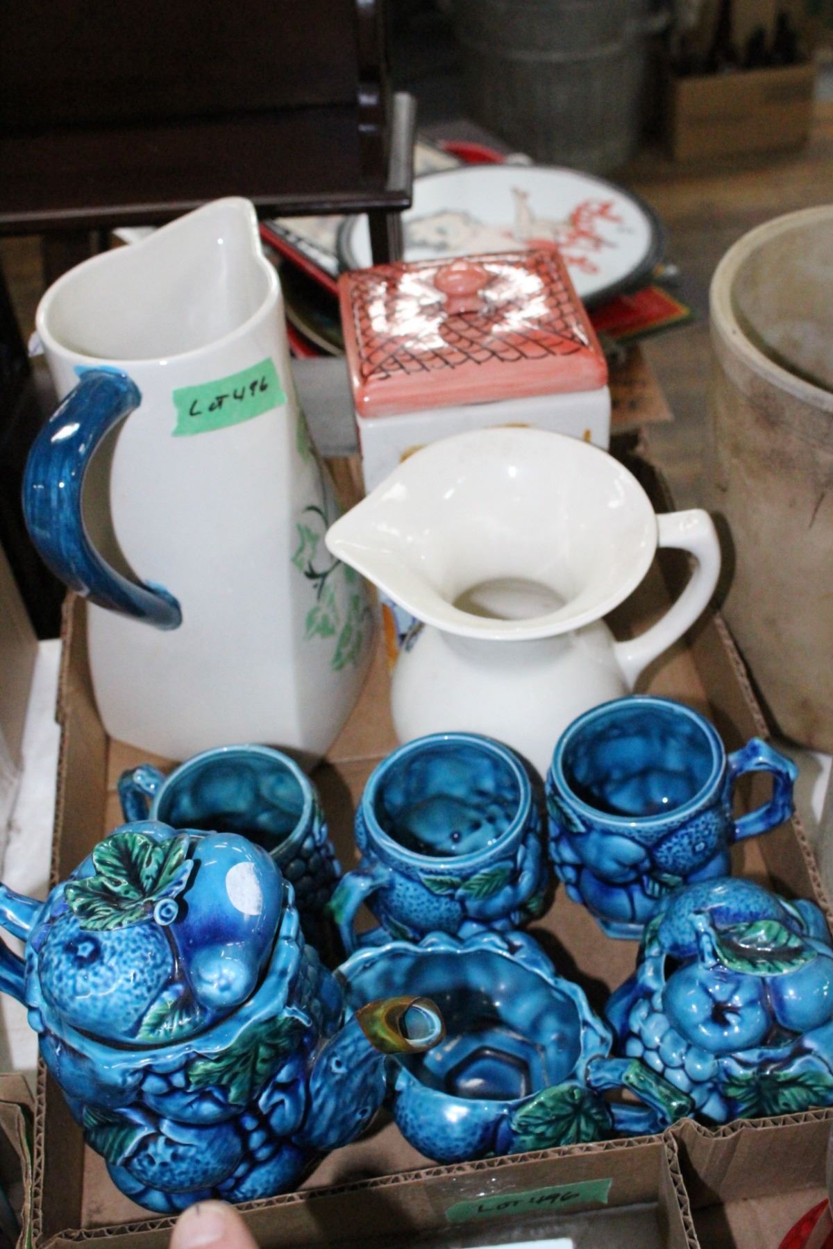 Flat with Tea Set (Grape Pattern); 2 Water Jugs and a Cookie Jar