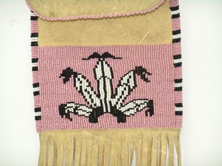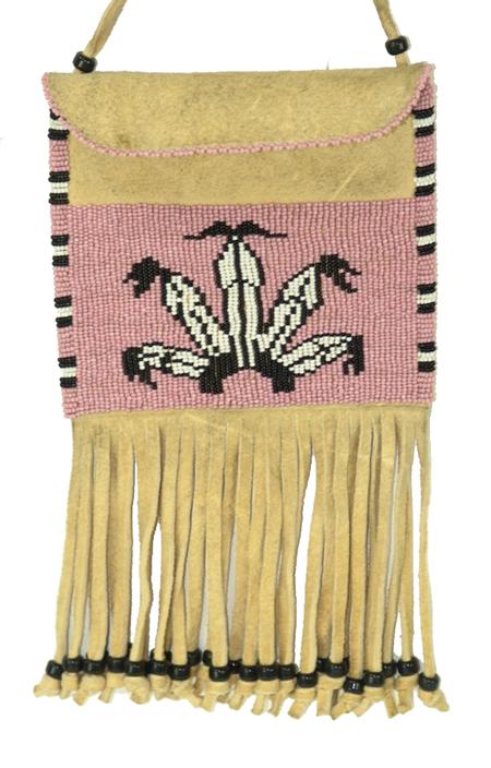 Circa 1970s, Small buckskin flap bag with long fringe and flat beaded panel with an interesting symbol on it. Very good condition. 6" x 6" + strap & fringe