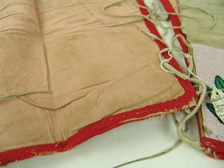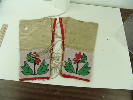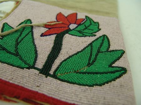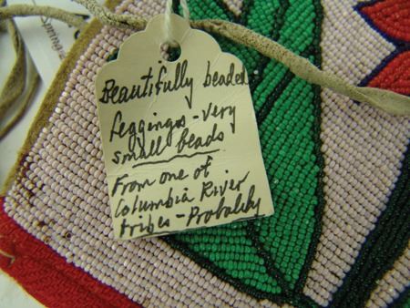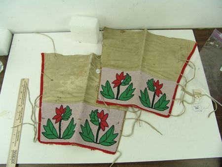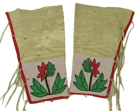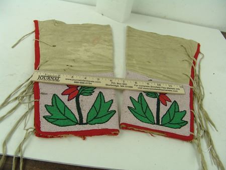 Early 1900s, Great old pair of buckskin leggings with tradecloth edging, calico lining, and beautiful roses on the finely beaded (20/0) panels. Very good condition, with minor stitch loss. 13" x 5"