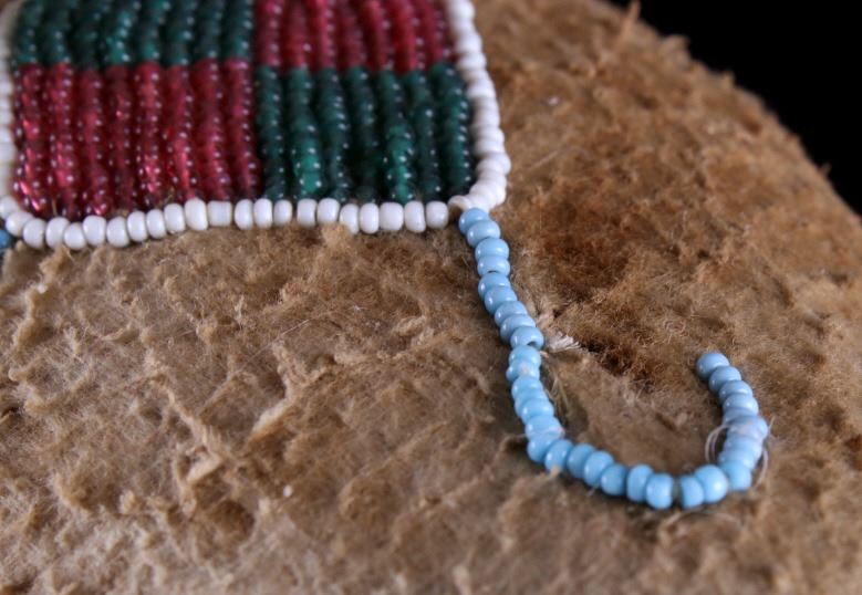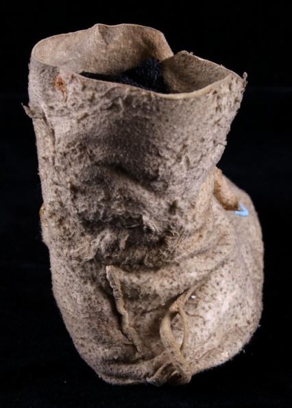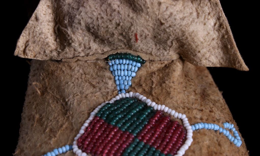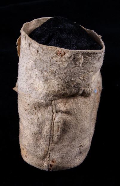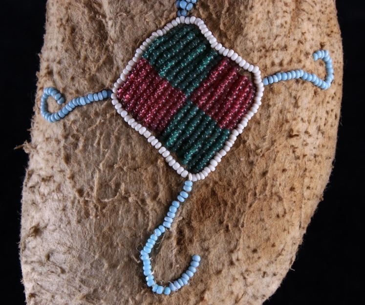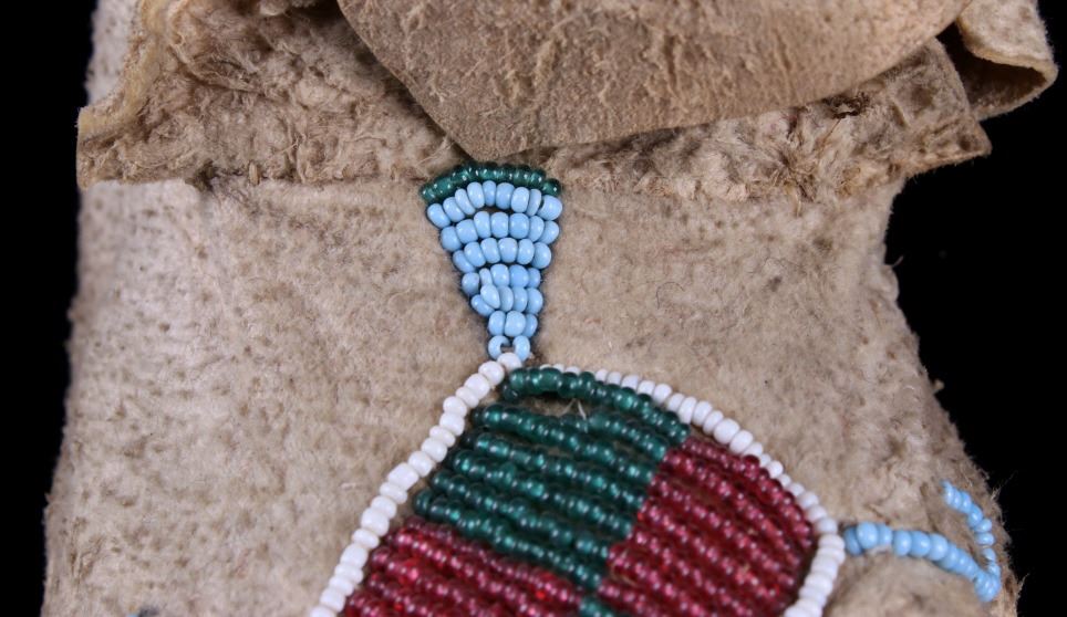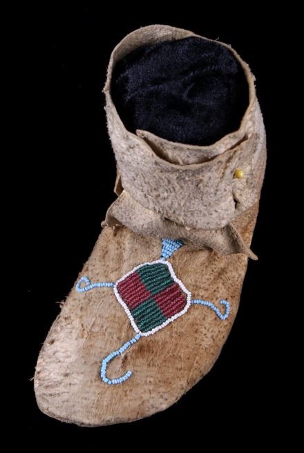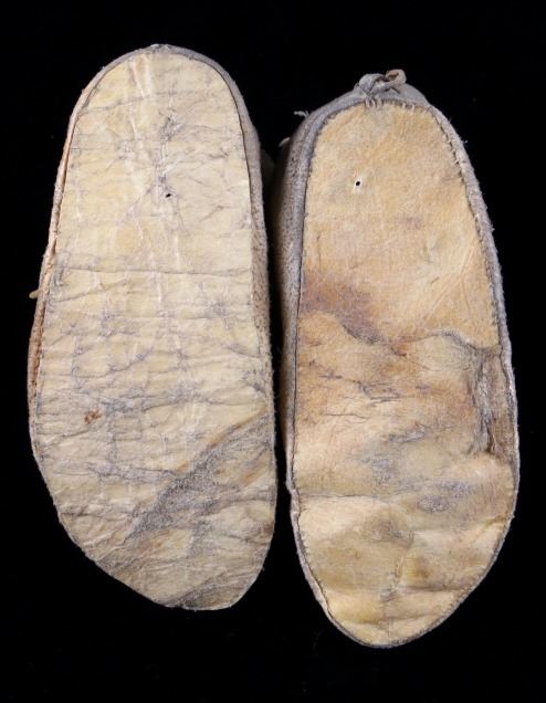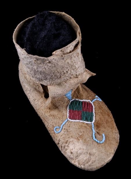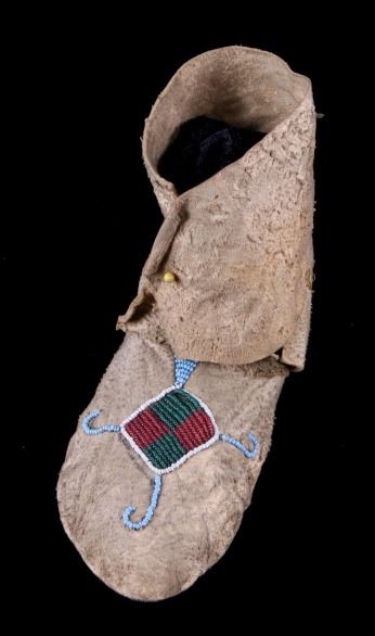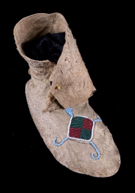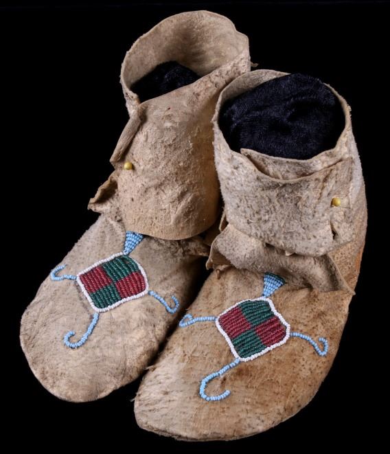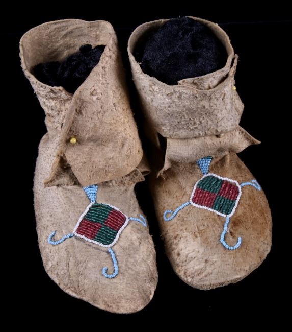 The lot features a set of Flathead Native American Indian beaded moccasins dating to the 19th Century. The moccasins originate from Montana and show an Indian tanned hide upper construction with Great American Bison Buffalo parfleche rawhide soles that are sinew sewn. The set shows a medium to high height ankle which wraps around the long tongue. The fronts of each moccasin show a cross like pattern in all period correct 19th Century glass trade seed beads of semi-transparent translucent Cheyenne pink, semi-transparent translucent green, sky padre blue and chalk white. The soles of the moccasins show the worn outlines of feet from many years of use. The set overall is very well preserved showing very good condition for its age with no major damage and little to no bead loss. Each moccasin measures 7"L by 4 1/2"H x 3"W.