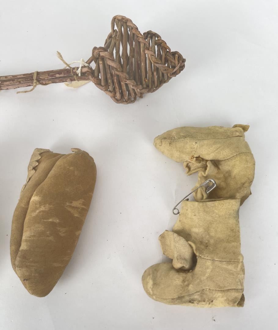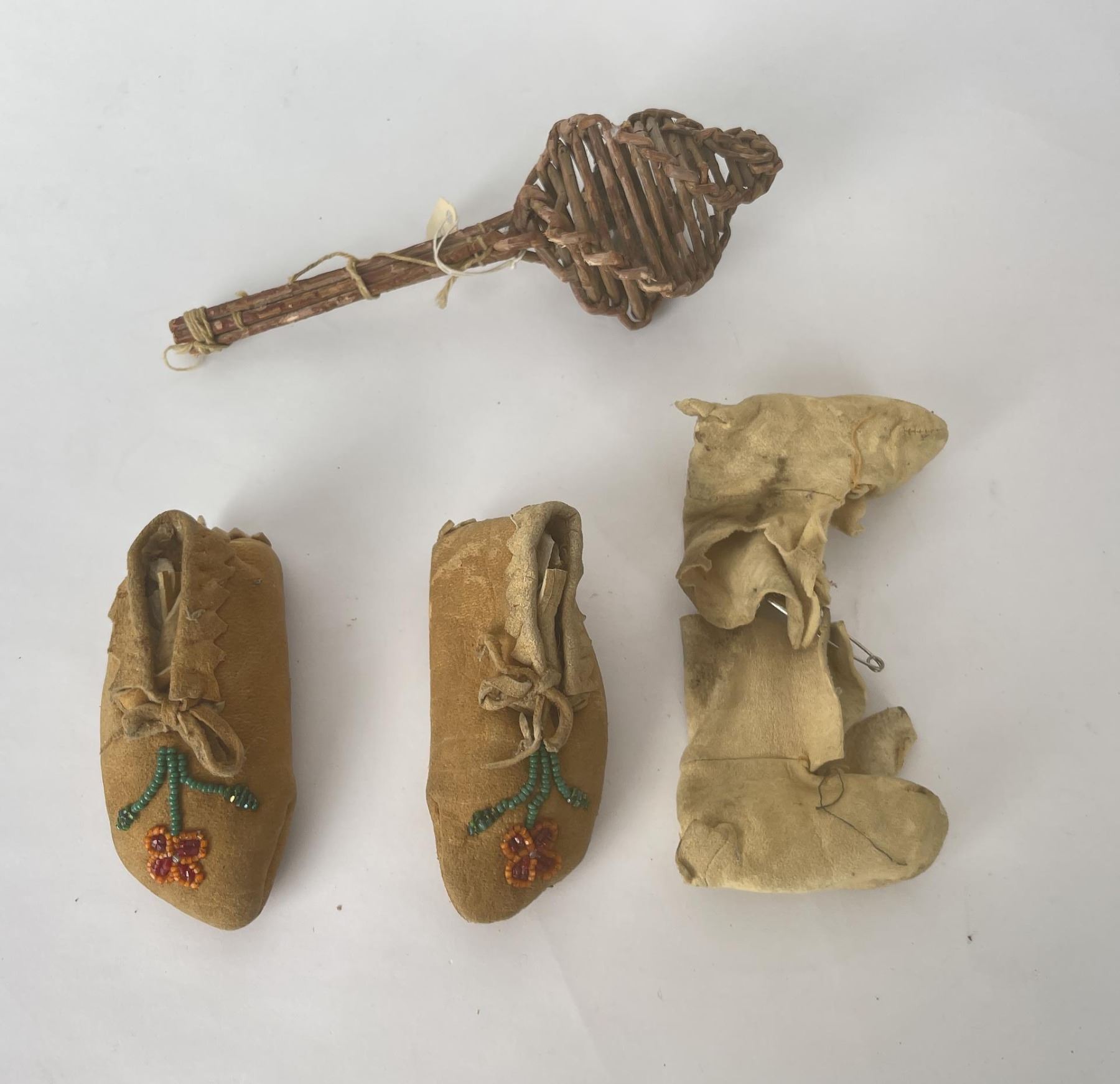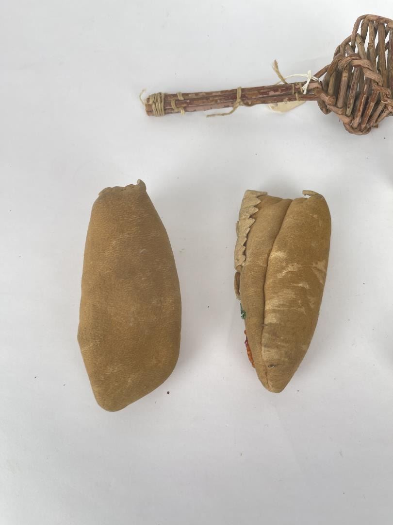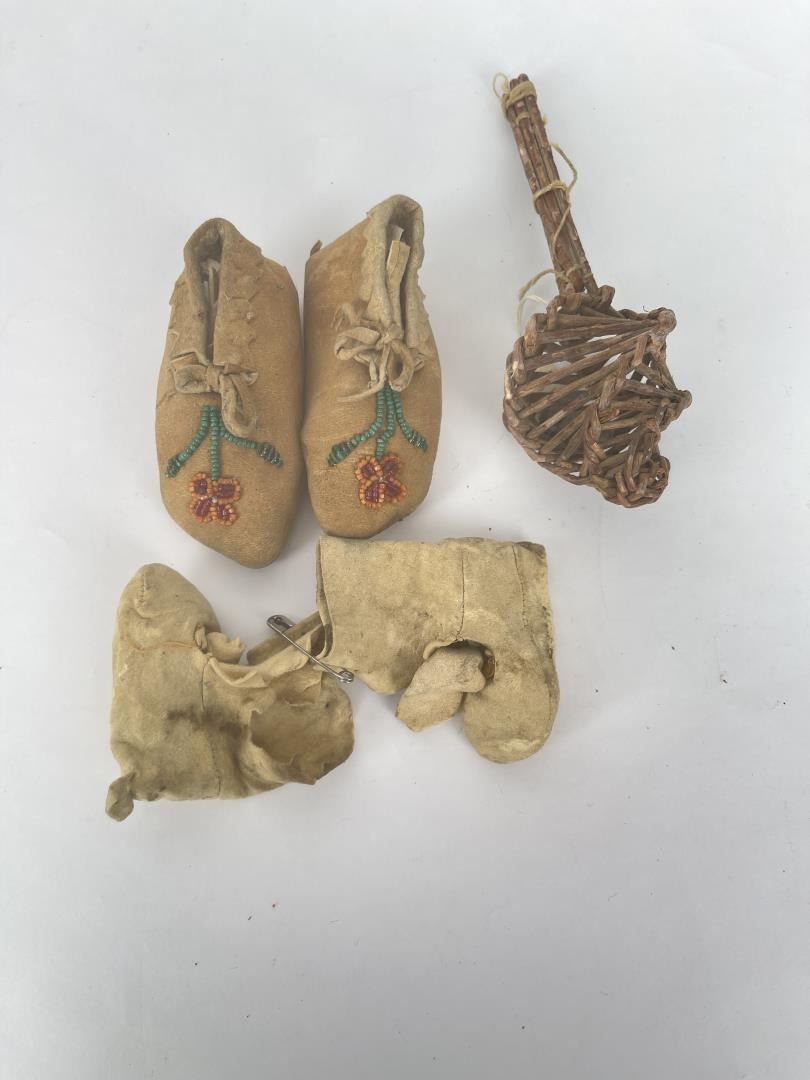 Very nice grouping. Two pair of Baby Moccasins, and a woven willow rattle.