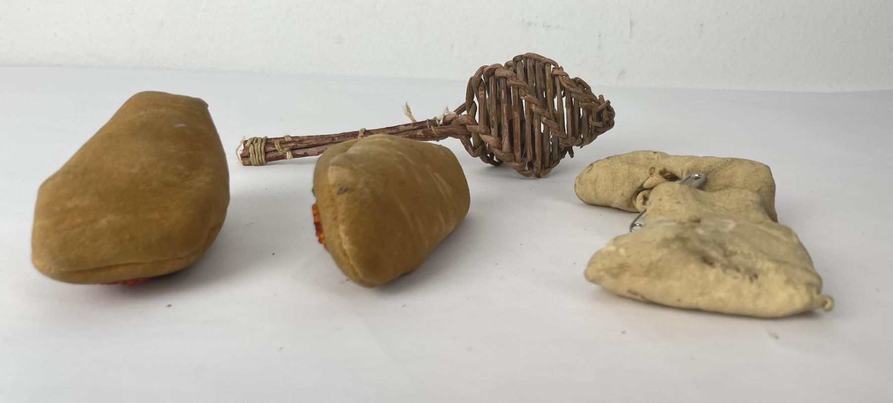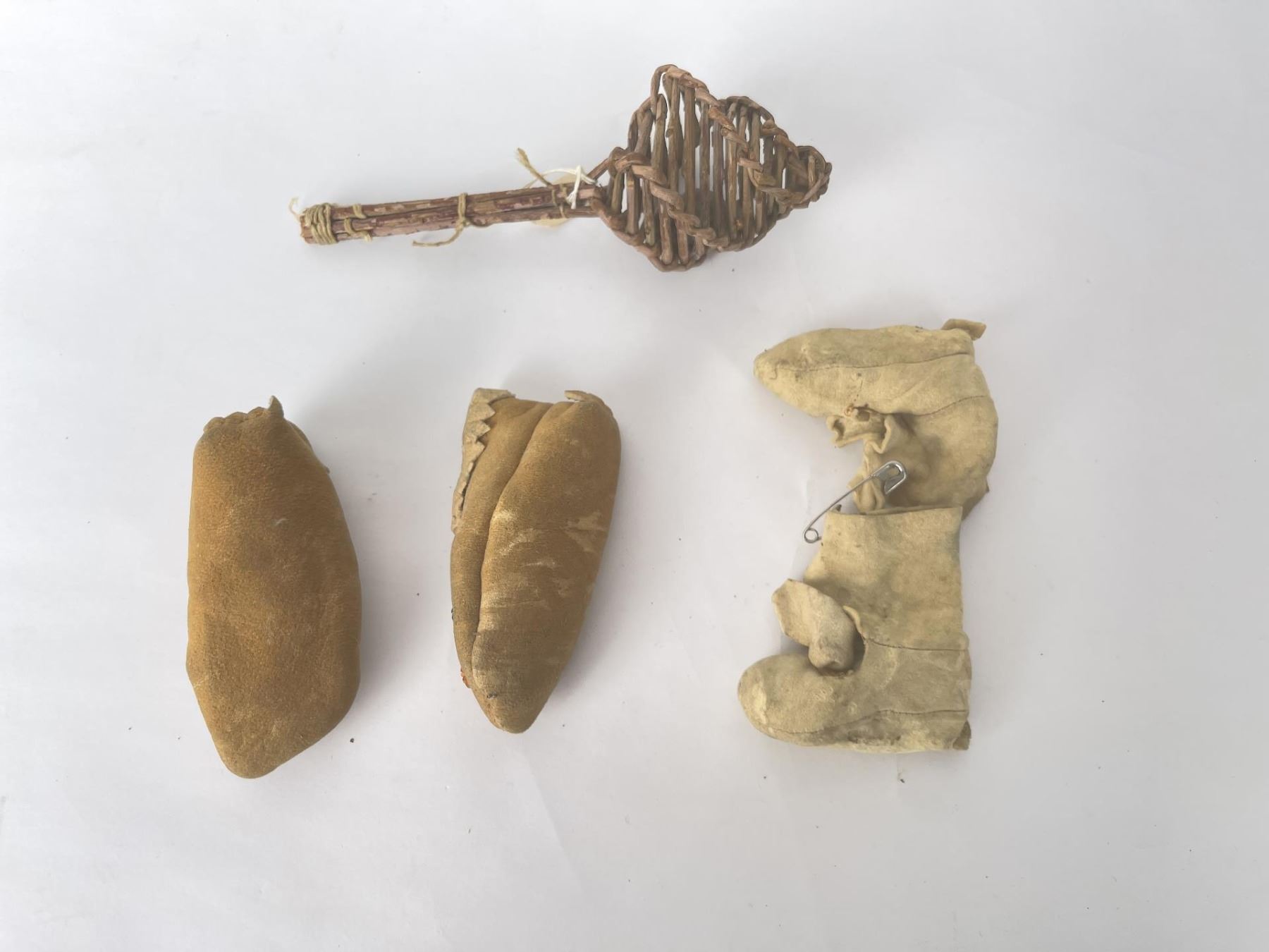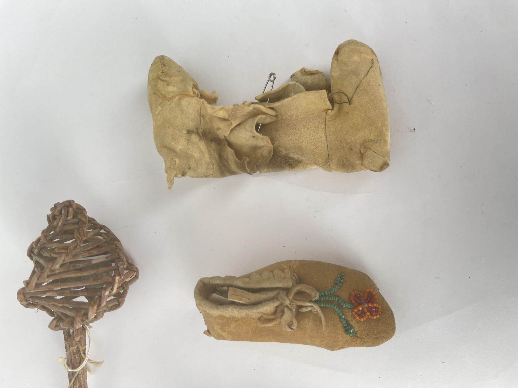 Very nice grouping. Two pair of Baby Moccasins, and a woven willow rattle.