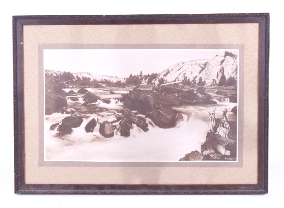 This is an authentic original photograph of Flathead Native American Indians by Herman Schnitzmeyer in 1916. Herman Schnitzmeyer was a renowned photographer from Polson, Montana who frequently photographed the landscapes and lives of the Western Frontier and Indians. This example, of a very large format, showing a beautiful mountain and river scene with three Flathead Indian women on the left. The piece is signed in the negative, “H Schnitzmeyer (copyright) 1916”. The photograph measures overall 19 ½ inches by 11 ½ inches in an original antique frame that measures 25.5”x18”. This and other photographs were taken from 1915-1916 when the United States Government put the Flathead Indian Reservation up for sale.