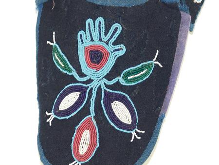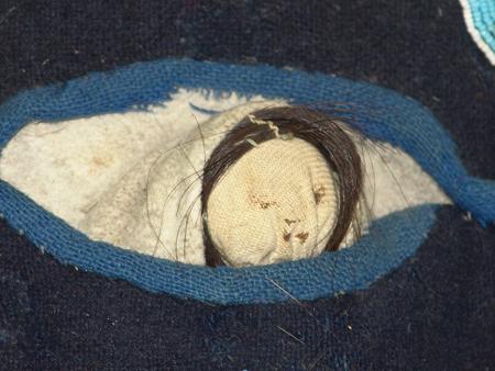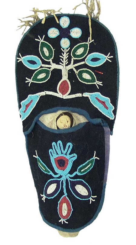 Circa Late 1800s, Rare tradecloth and buckskin cradleboard with traditional flowing florals and fringe on back, complete with a handmade doll. Very good condition, minor bead loss. A rare specimen. 15" x 7"