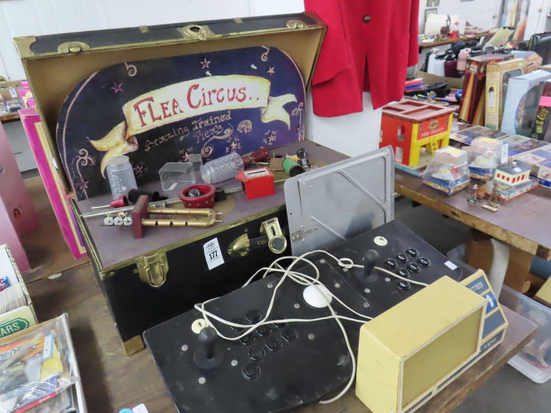 Flea Circus Travel Trunk, Vtg. Game Controllers, Cigarette Merchandising Sign
