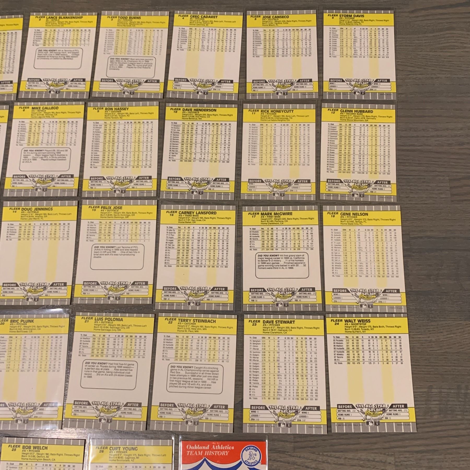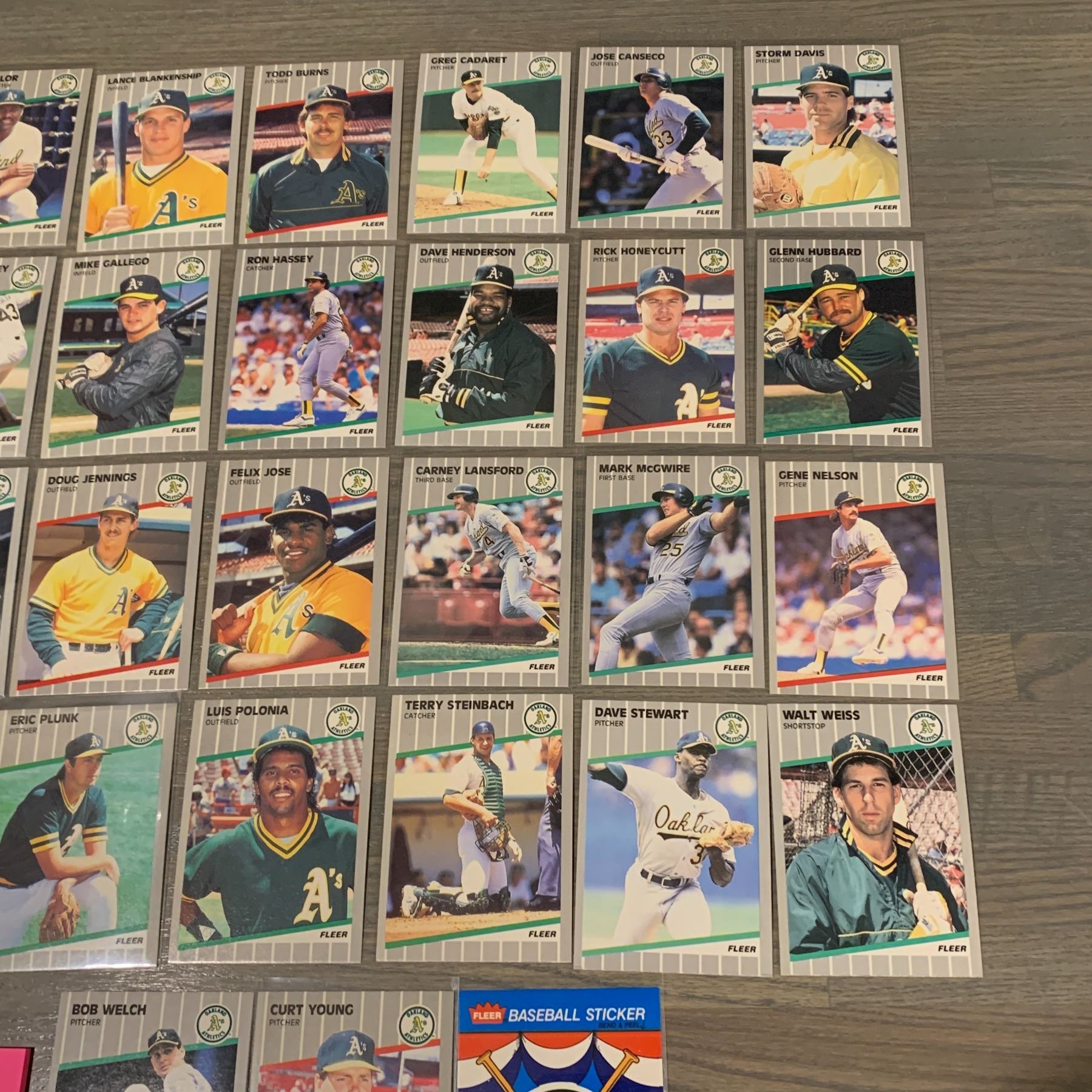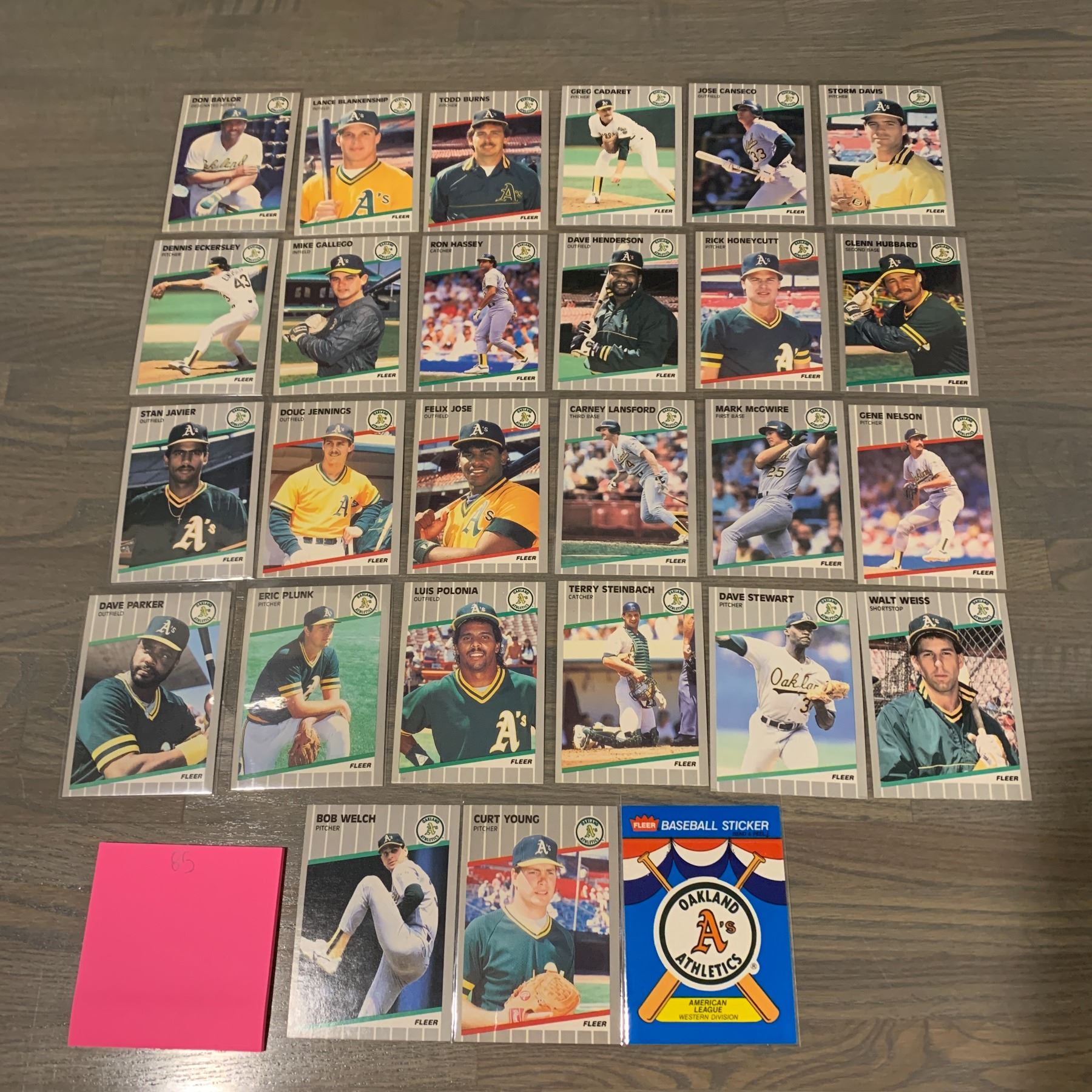 Fleer 1989 Athletics Baseball Cards. #1-26. Carney Lansford #16, Storm Davis #6, and Rare Athletics Team Sticker Card. See Photos for conditions. See photos for condition. If you are interested in consigning with us, email aeronhouse1994@gmail.com or fill out the consignment form on ahauctionhouse.com