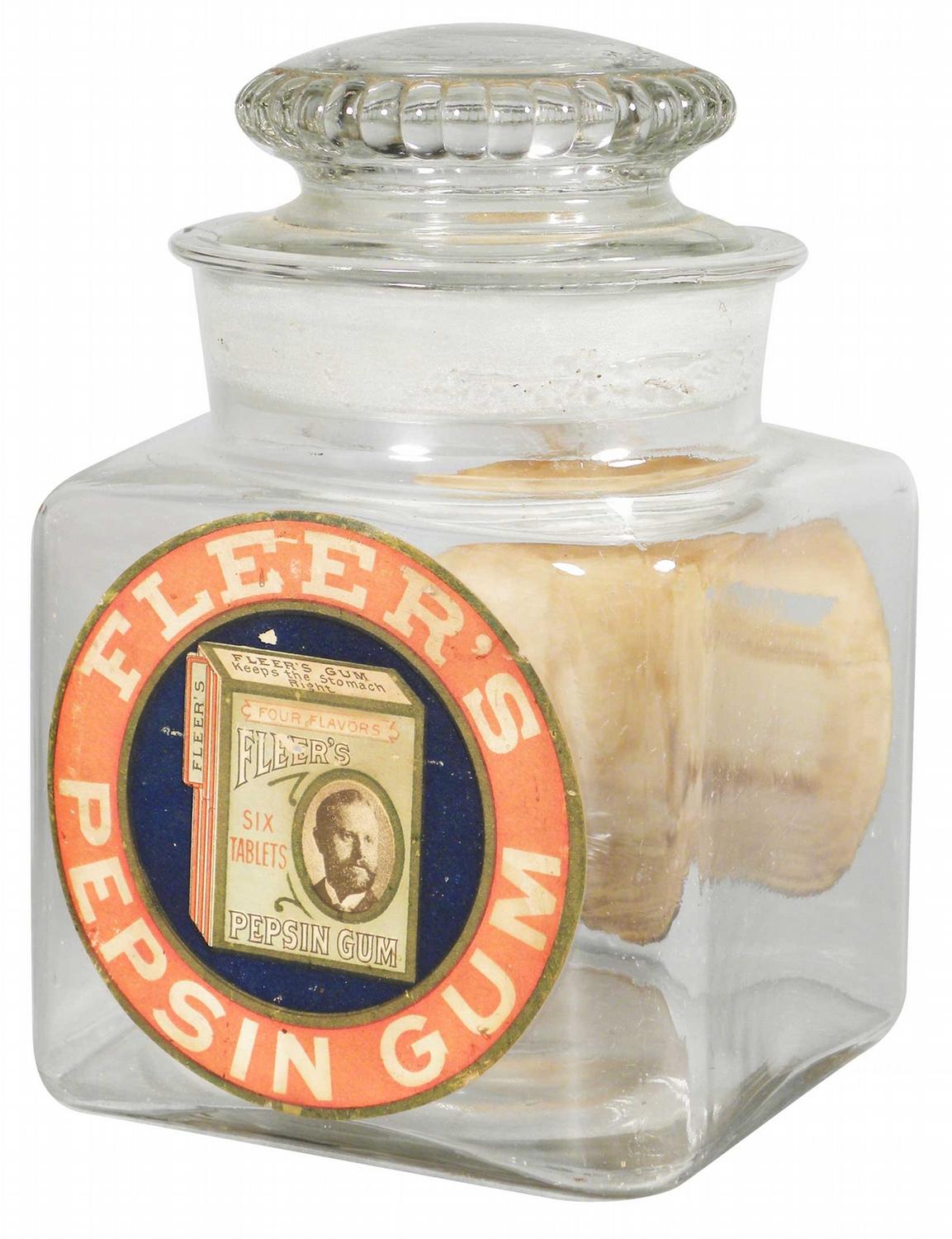 Fleer's Pepsin Gum Store Jar. Original paper labels, one is brighter with less paper loss and a chip on the outside lip of the jar otherwise very good condition. 4 1/2 inch square X 6 inches tall.