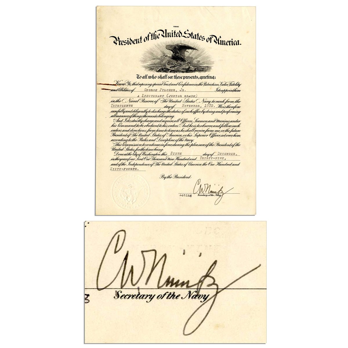 Admiral Chester Nimitz naval appointment signed as ''Acting Secretary of the Navy'', dated 6 December 1939. Document features an elegant patriotic emblem at top and appoints a George Pilcher, Jr. to Lieutenant in the Navy Reserve. Boldly signed ''C.W. Nimitz'' in black ink. Official Navy blindstamp at lower left. One page document measures 8'' x 10.5''. Uniform toning and paperclip residue, else near fine.