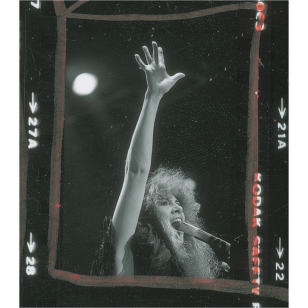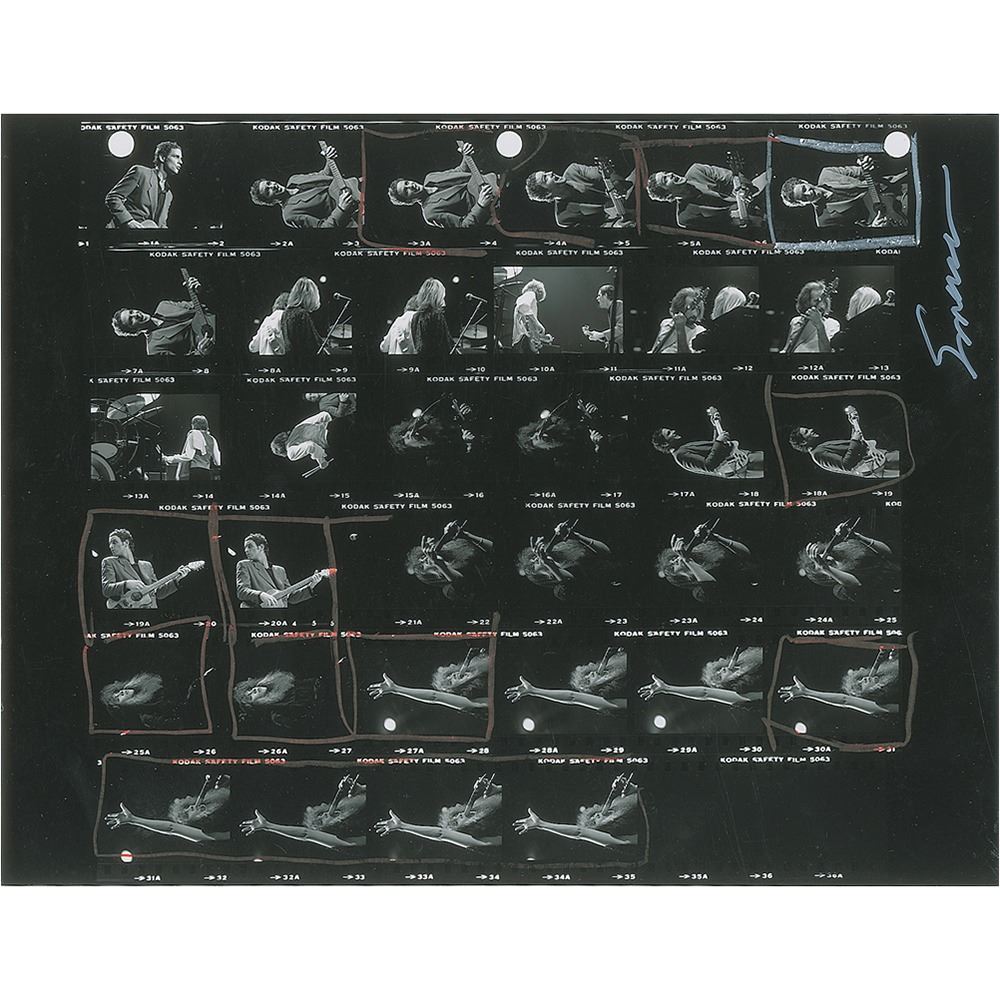 Original vintage glossy 8.5 x 11 contact sheet print containing 34 images of Fleetwood Mac in concert in Japan taken by Sam Emerson, most prominently featuring vocalist Stevie Nicks and guitarist Lindsey Buckingham: Nicks is seen singing with one arm dramatically raised, and Buckingham is shown cheerfully playing his acoustic-electric guitar; Mick Fleetwood is also seen in a few shots. Signed in the lower right corner in white ink by photographer Sam Emerson, "Emerson." Reverse is annotated "Japan" and "R-163." In fine condition, with a few red-and-white grease pencil editorial notations and three filing holes to the right edge.