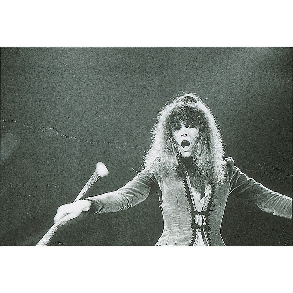 Original vintage glossy 11 x 8.5 contact sheet print containing 37 images of Fleetwood Mac in concert taken by Sam Emerson, most prominently featuring guitarist Lindsey Buckingham and vocalist Stevie Nicks: Buckingham is shown soloing on his acoustic-electric guitar in most of the shots, with five of them showing him and Nicks singing together. Nicks is seen alone in the bottom row, with Christine McVie and her accordion seen in a single image. Signed vertically in the right margin in white ink by photographer Sam Emerson, "Emerson." Reverse bears "This paper manufactured by Kodak" watermarks. In very good to fine condition, with a light diagonal crease passing through the bottom row, a few red grease pencil editorial notations, and three filing holes to the bottom edge.