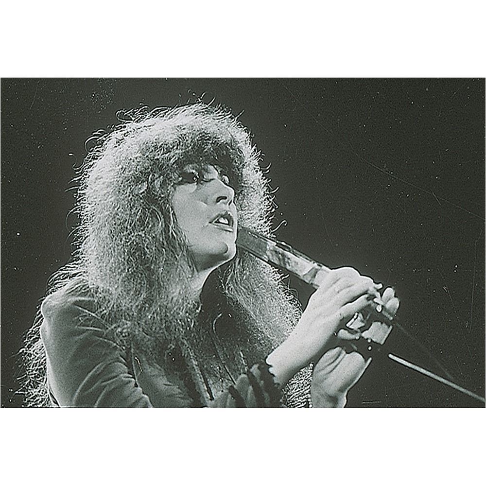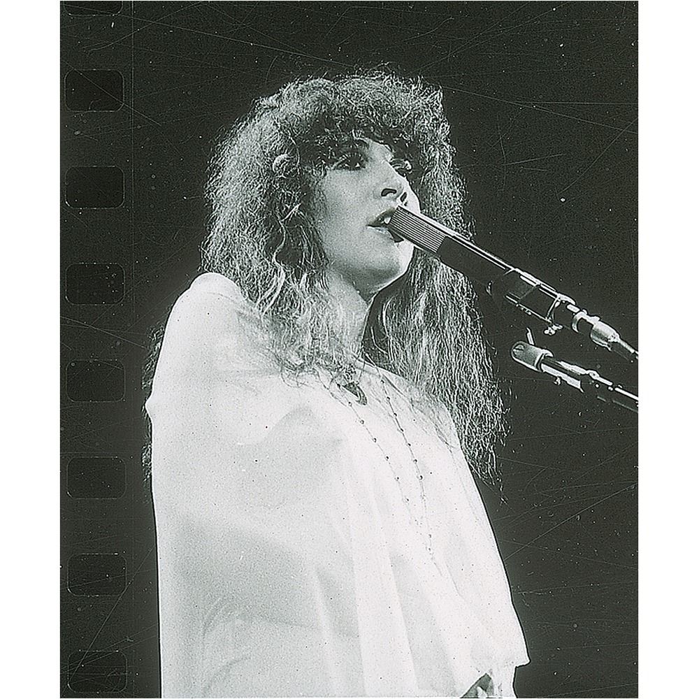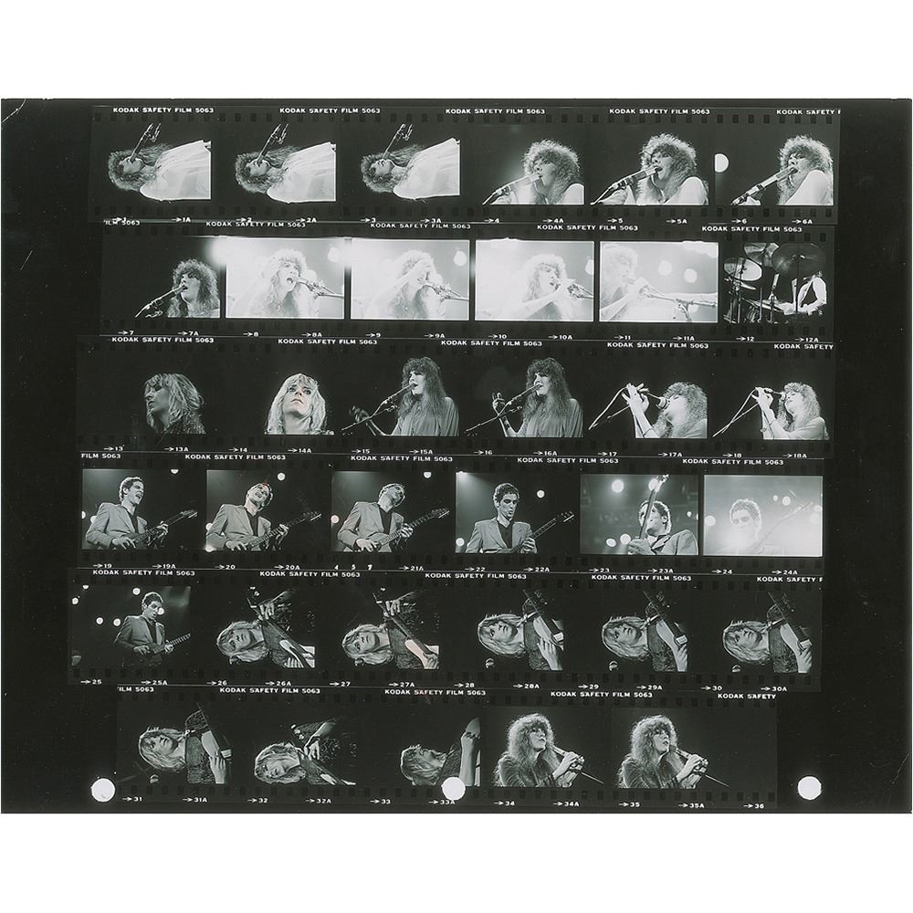Original vintage glossy 11 x 8.5 contact sheet print containing 35 images of Fleetwood Mac in concert taken by Sam Emerson, featuring Stevie Nicks, Lindsey Buckingham, and Christine McVie in equal measure: Nicks sings under the bright stage spotlights, Buckingham plays his acoustic-electric guitar, and McVie likewise strums her instrument. A lone image shows Mick Fleetwood, obscured by his drum set's cymbals. Reverse bears a Sam Emerson credit stamp and "This paper manufactured by Kodak" watermarks. In fine condition, with three filing holes to the bottom edge.