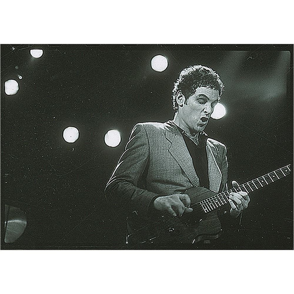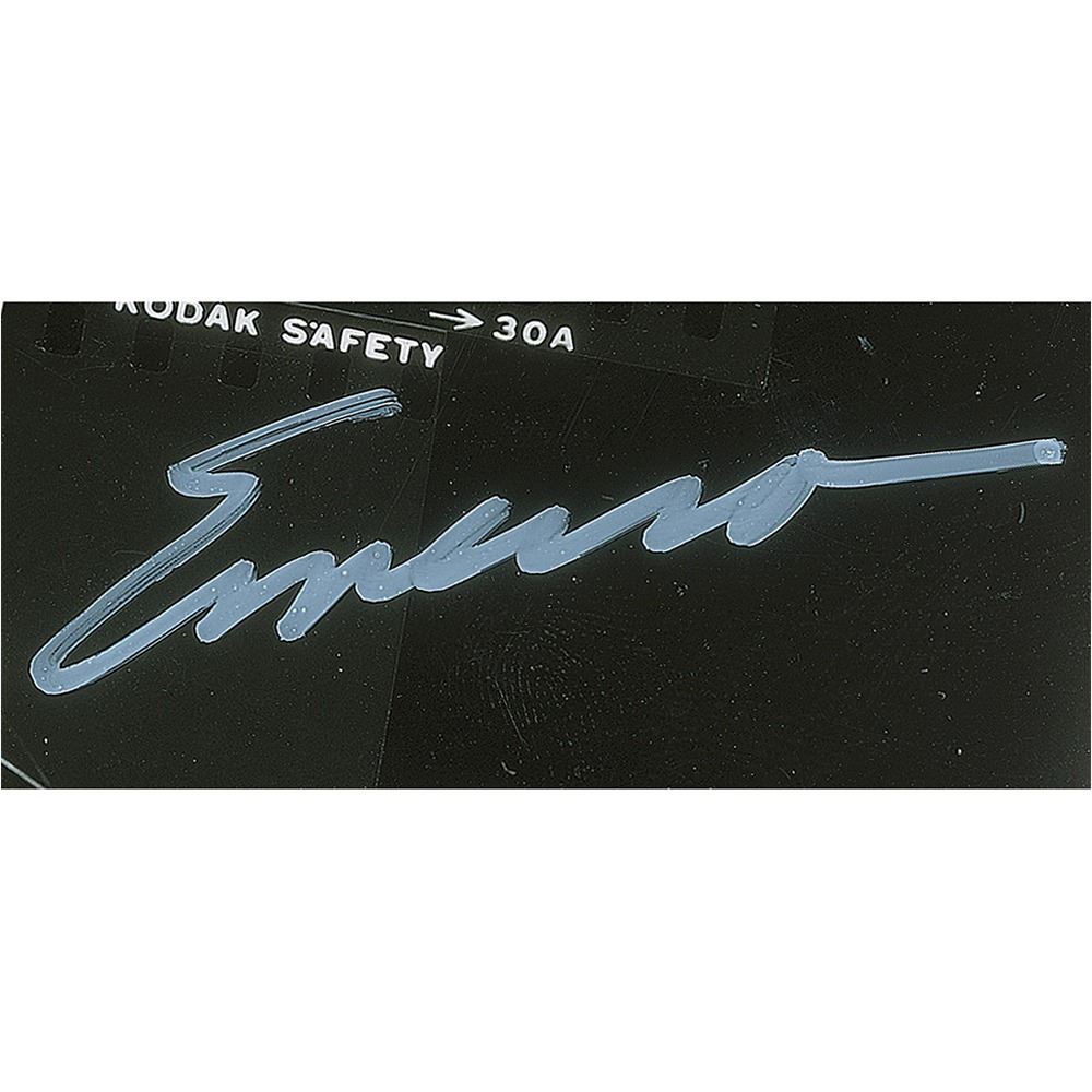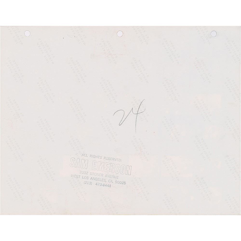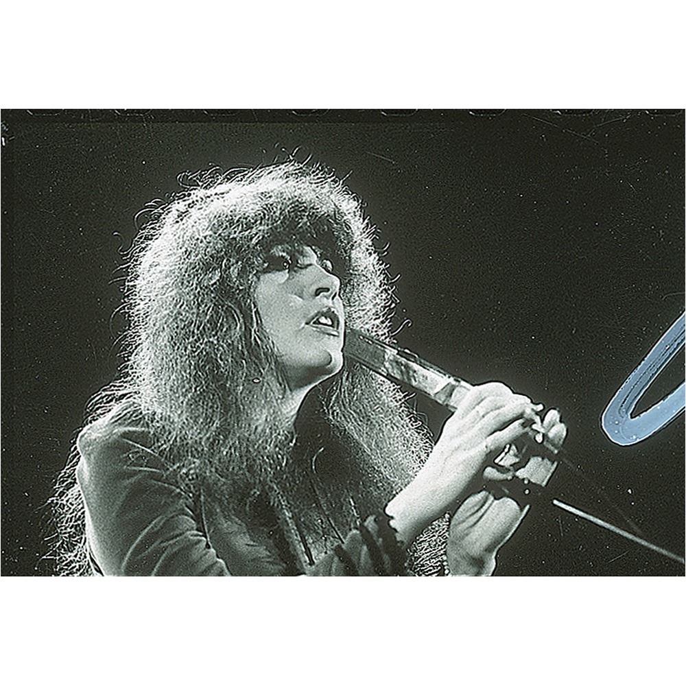 Original vintage glossy 11 x 8.5 contact sheet print containing 35 images of Fleetwood Mac in concert taken by Sam Emerson, featuring Stevie Nicks, Lindsey Buckingham, and Christine McVie in equal measure: Nicks sings under the bright stage spotlights, Buckingham plays his acoustic-electric guitar, and McVie likewise strums her instrument. A lone image shows Mick Fleetwood, obscured by his drum set's cymbals. Signed in the lower right corner in white ink by photographer Sam Emerson, "Emerson." Reverse bears a Sam Emerson credit stamp and "This paper manufactured by Kodak" watermarks. In fine condition, with three filing holes to the bottom edge.