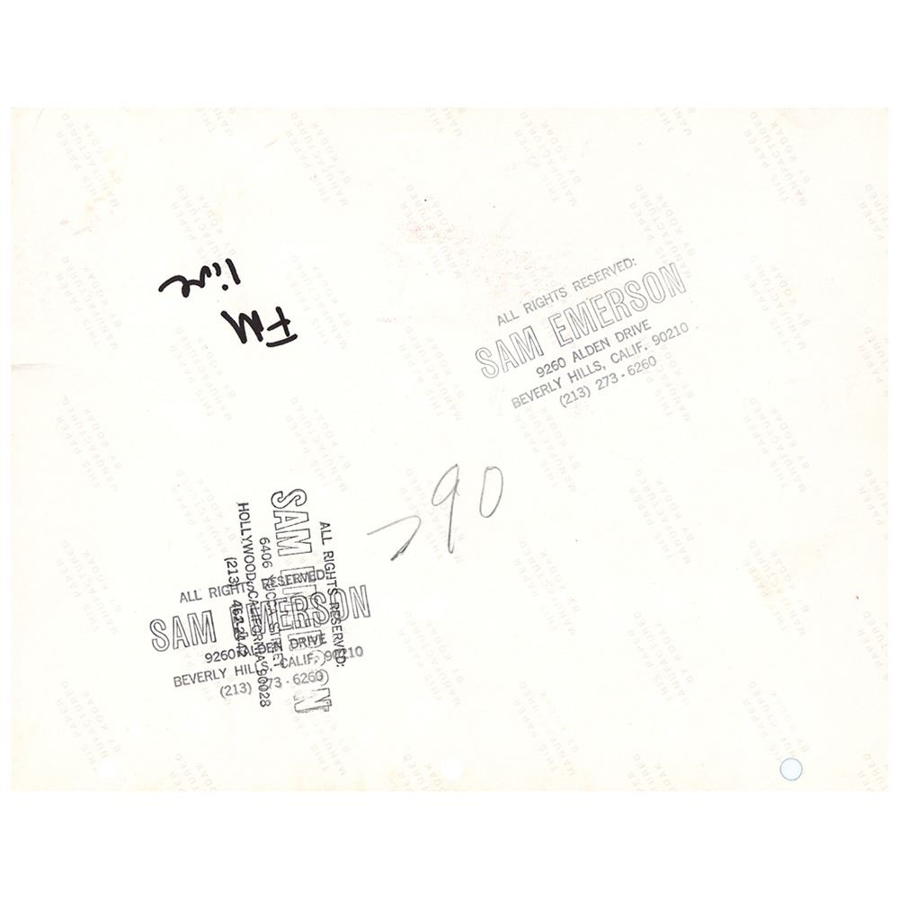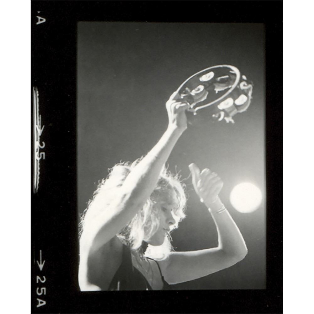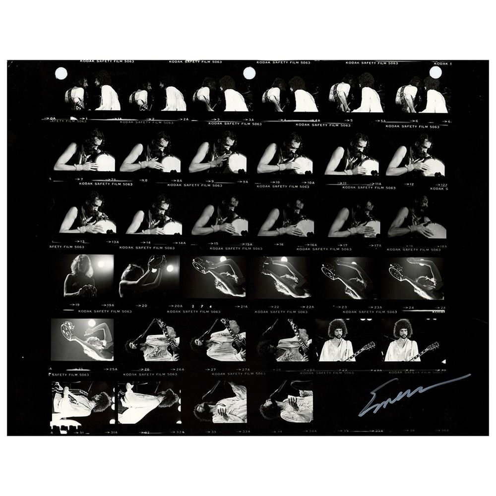 Original vintage glossy 11 x 8.5 contact sheet print containing 34 images of Fleetwood Mac in concert taken by Sam Emerson, featuring sequences that show John McVie and Lindsey Buckingham side-by-side, Mick Fleetwood pounding a hand drum, Stevie Nicks shaking a tambourine, and Lindsey Buckingham soloing and singing. Signed in the lower right corner in white ink by photographer Sam Emerson, "Emerson." Reverse bears Sam Emerson credit stamps and "This paper manufactured by Kodak" watermarks. In fine condition, with three filing holes to the top edge.