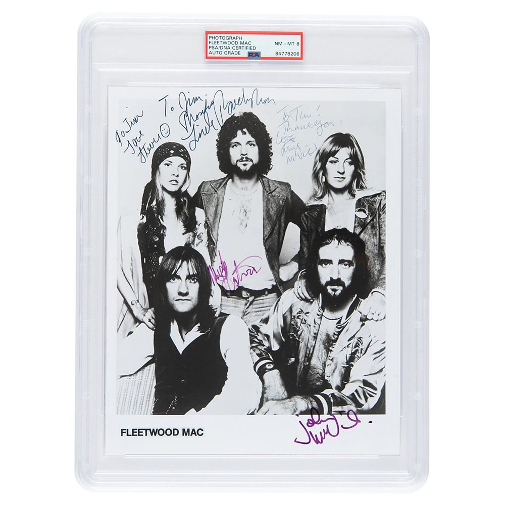 Uncommon glossy 8 x 10 early promotional photo of Fleetwood Mac, signed and inscribed in various inks by Stevie Nicks (who adds a smiley face), Mick Fleetwood, Lindsey Buckingham, and John and Christine McVie. In fine condition. A highly desirable and fully signed image of the band& rsquo;s most successful lineup. Encapsulated and graded by PSA/DNA as "NM-MT 8."