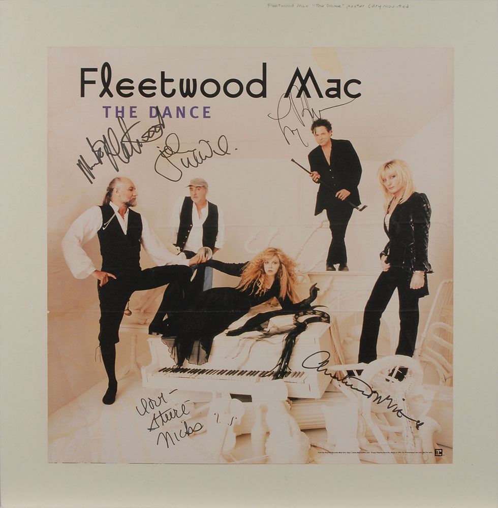 Appealing color 18 x 19.5 promotional poster for the release of Fleetwood Mac's 1997 live album The Dance, signed in black felt tip, "Love-Stevie Nicks," "Christine McVie," "Lindsey Buckingham," "John McVie," and "Mick Fleetwood." Affixed to a slightly larger mount. Dry mounted and in very good condition, with several horizontal creases and a stain to top edge. Pre-certified REAL.