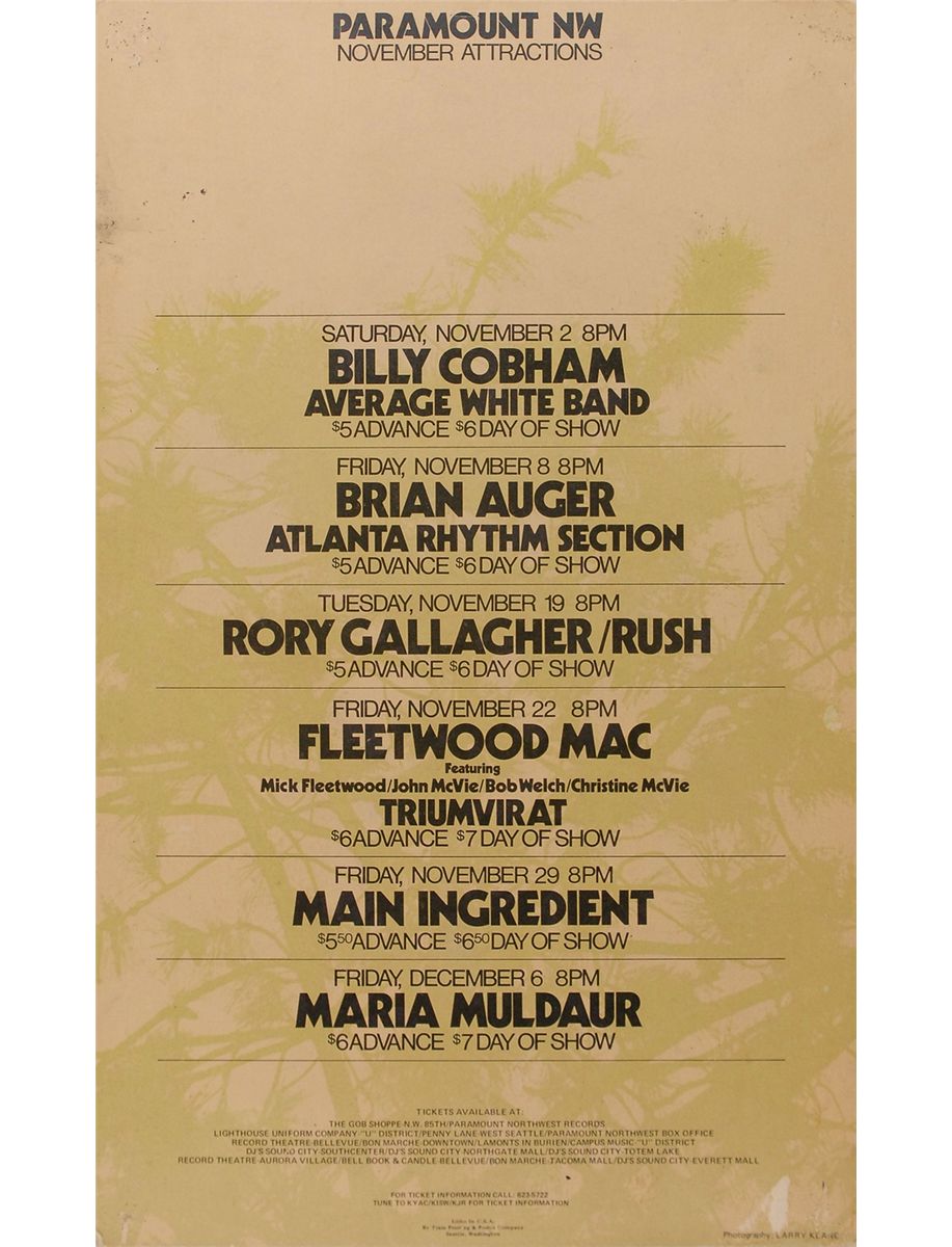 Original 13.25 x 22 color poster for upcoming 1974 shows at the Paramount Northwest in Seattle, Washington. Among the acts listed are Fleetwood Mac (with Bob Welch), the Average White Band, and Rory Gallagher supported by Rush, all set against a light image of a pine tree. Multiple tack holes to corners, a bit of light dampstaining to right edge, and some scattered light soiling, mainly to left side, otherwise fine condition.