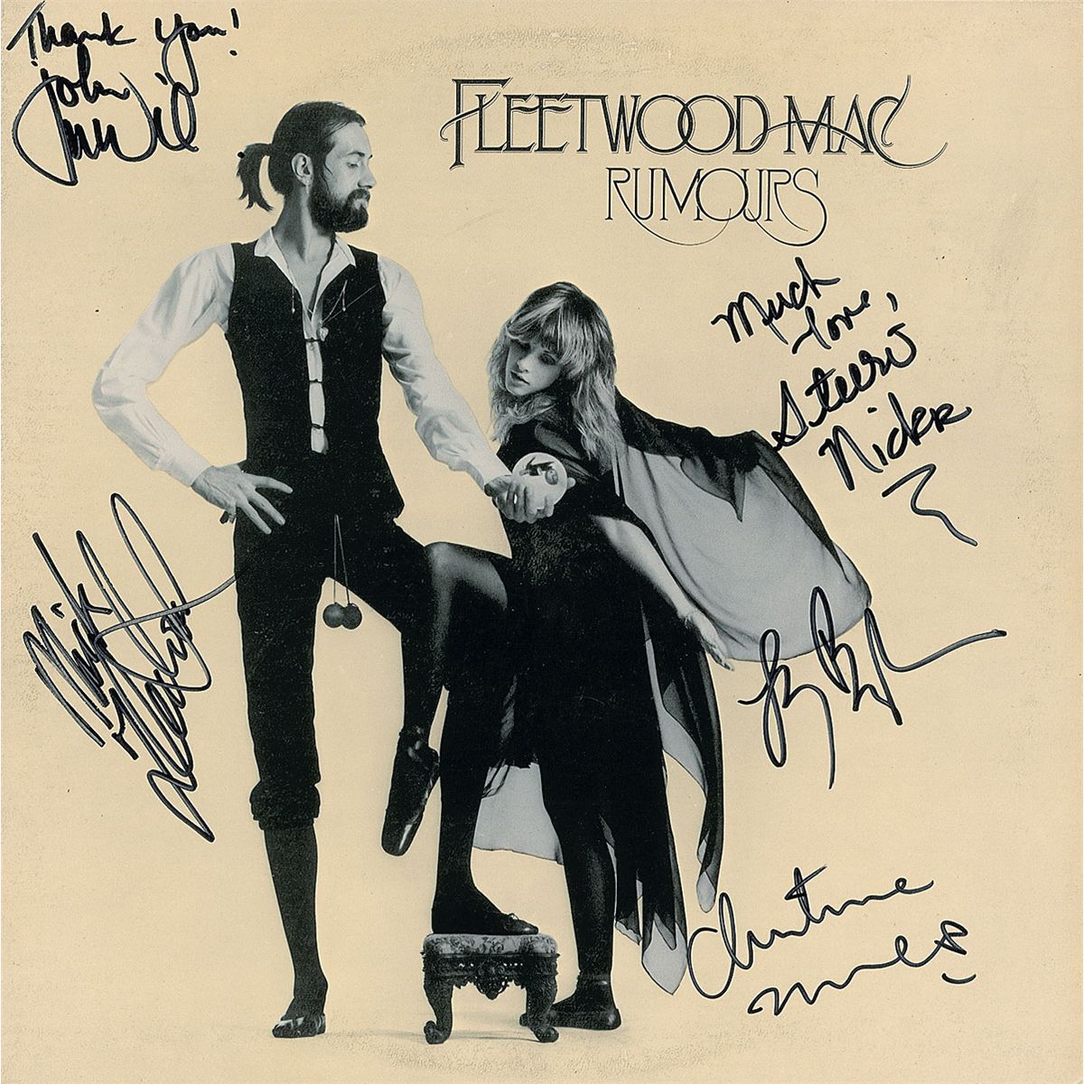 Rumours album signed on the front cover in black felt tip by Christine McVie, John McVie, Lindsey Buckingham, Stevie Nicks, and Mick Fleetwood. In fine condition, with a very mild ‘ring of wear’ to front cover. The record is included. Accompanied by a full letter of authenticity from Roger Epperson/REAL. Rumours won a Grammy Award in 1978 for Album of the Year for 1977, and spent 31 weeks at the top of the Billboard Music Charts, in spite of critical panning for perceived pandering to mainstream tastes. By 2003, the album had sold more than nineteen million copies in the United States alone and was certified by the RIAA as the third-highest selling single-disc album in history.