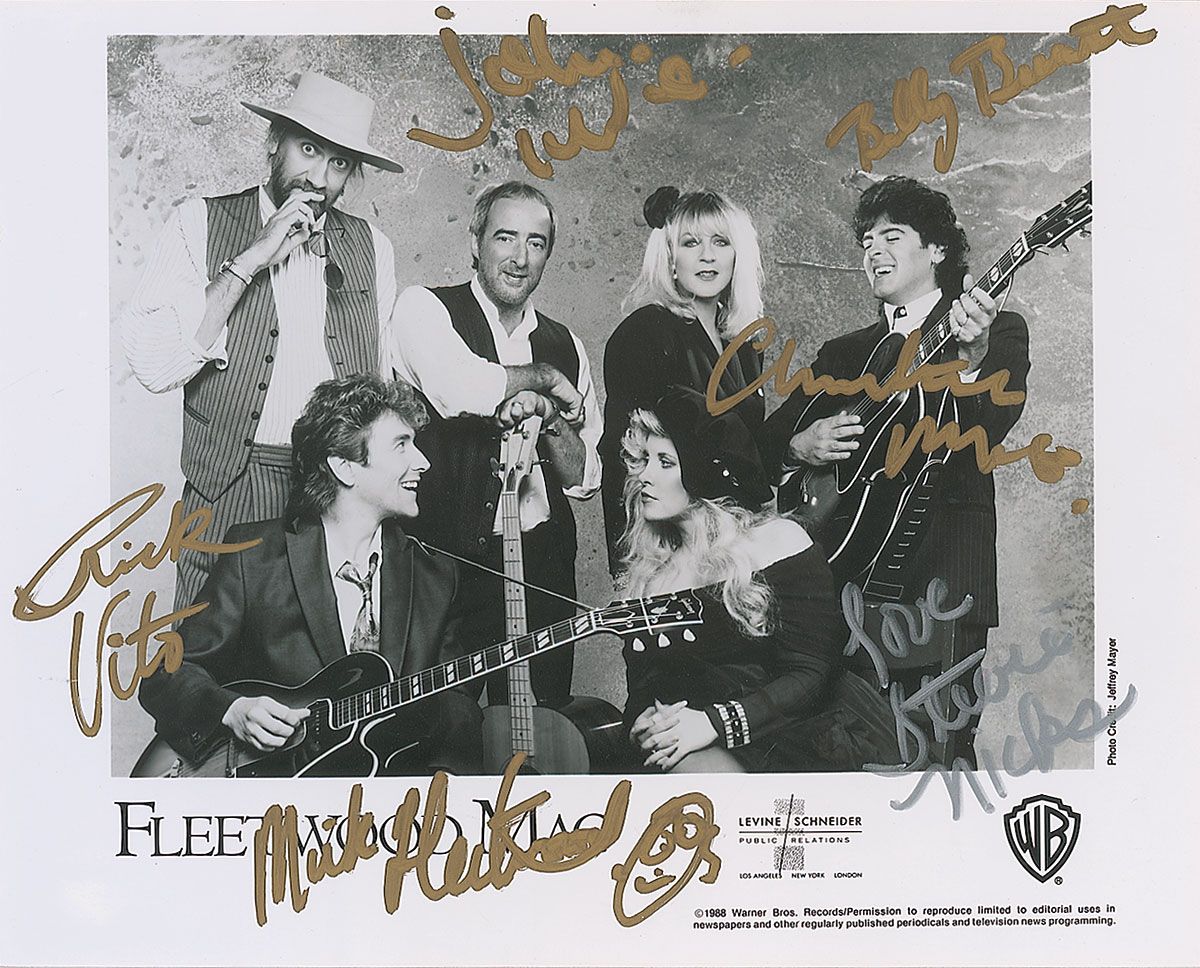 Satin-finish 10 x 8 Warner Bros. Records group publicity photo, signed in silver ink by Stevie Nicks and in gold ink by John McVie, Christine McVie, Rick Vito, Billy Burnette, and Mick Fleetwood, adding a quick self-portrait caricature next to his signature. In fine condition.