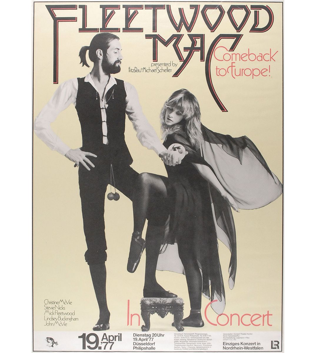Original color promotional poster for the band’s concert at Philipshale in Dusseldorf, Germany on April 19, 1977. Poster measures 23.5 x 32.5 and features the album cover art work for Rumours. In fine condition, with a few scattered small edge tears.