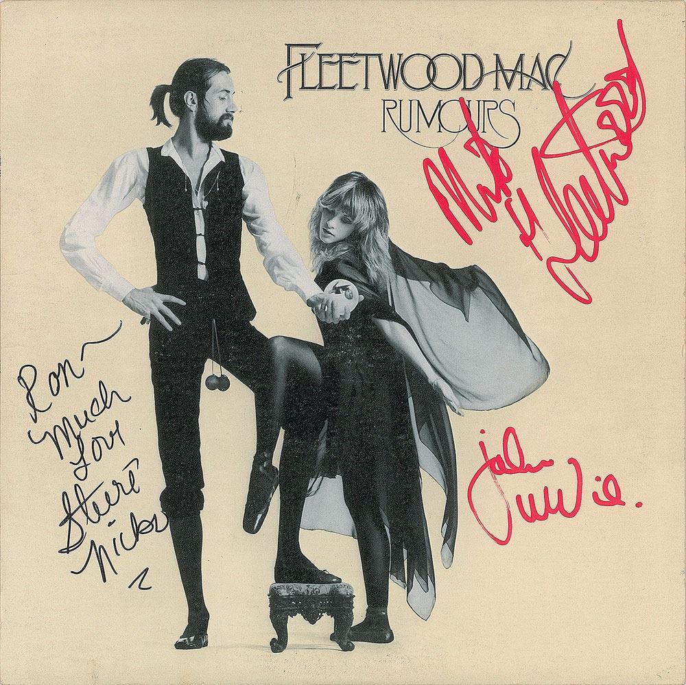 Rumours album signed and inscribed on the front cover in black felt tip, "Ron—Much love, Stevie Nicks," and in red paint pen, "Mick Fleetwood" and "John McVie." In fine condition. The record is included. Accompanied by a photo taken at the time of the Fleetwood signing.