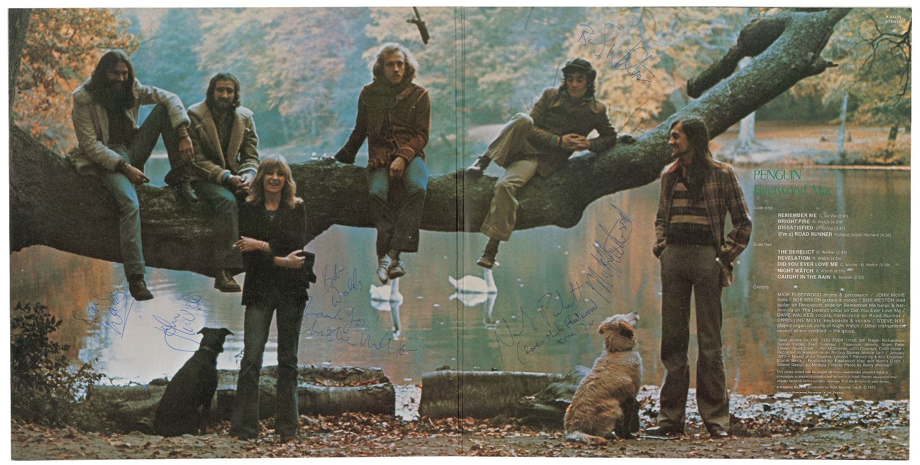 Penguin album by Fleetwood Mac, signed on the inner gatefold in blue ballpoint, "Mick Fleetwood," "Thank you! Christine McVie," "John McVie," "Bob Welch," "Bob Weston," "Dave Walker," and "Nick Pickett (loves Mick Fleetwood true) x." In fine condition, with light scuffing, and a few small staple holes. The record is not included.