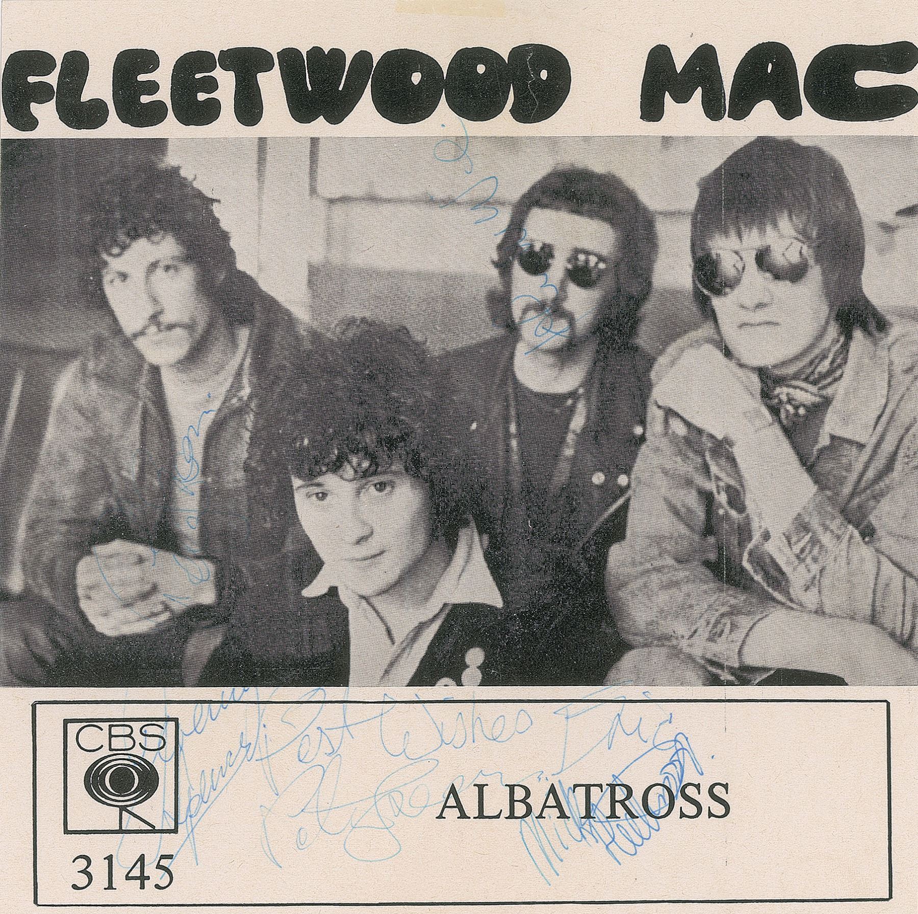 CBS Records 45 RPM record sleeve for 'Albatross,' signed in blue ballpoint by Peter Green (2), Mick Fleetwood, Jeremy Spencer, and John McVie. In fine condition, with the sides of the sleeve neatly cut. The record is not included.