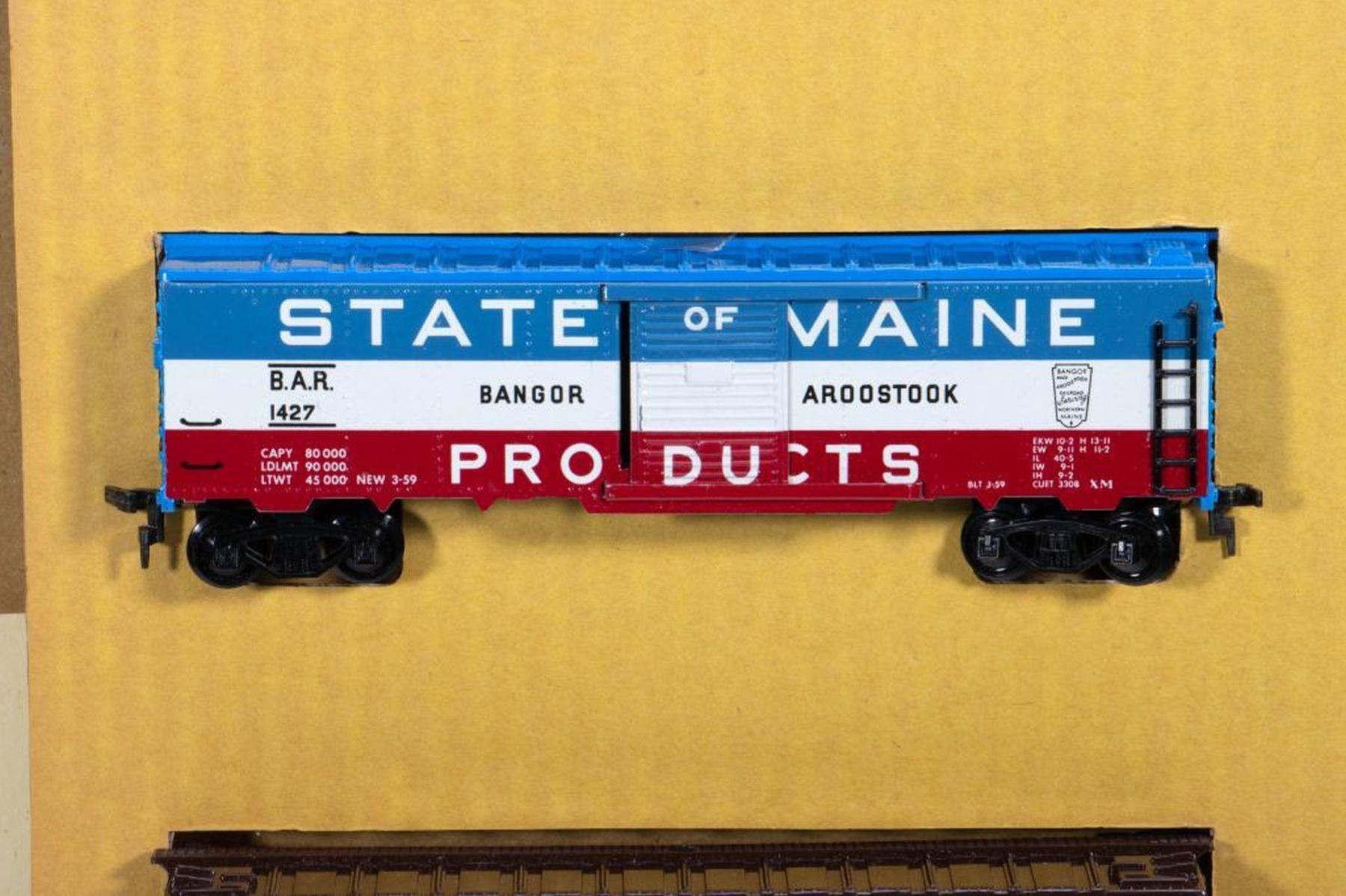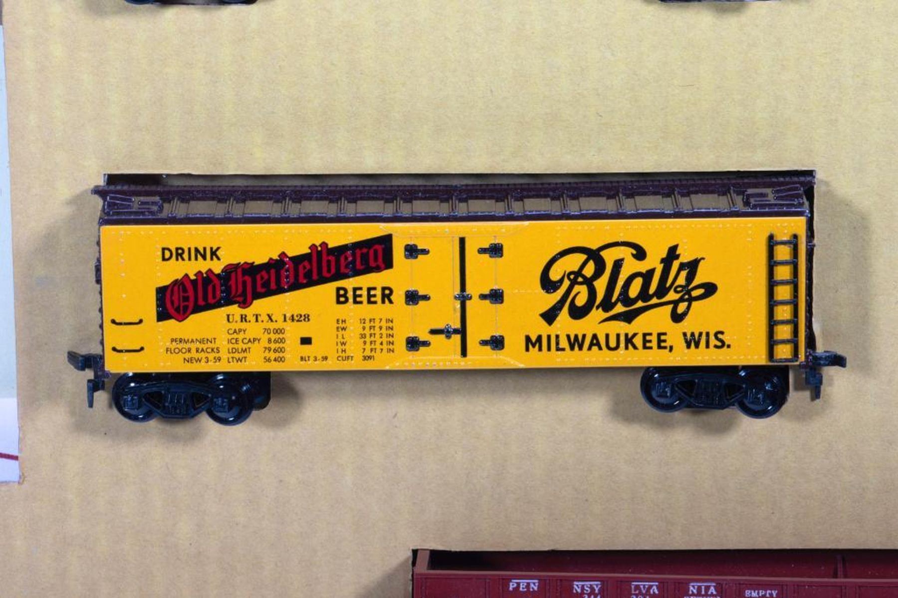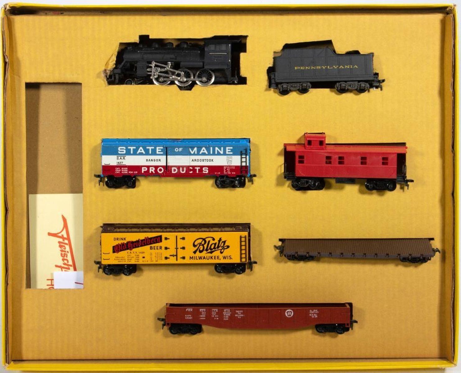 Fleischmann American Prototype Steam Locomotive Set. 2-6-0 Locomotive and Tender lettered for Pennsylvania. State of Maine Box Car, Blatz Beer Reefer, PRR Gondola, unlettered flat car and caboose. Track and Tyco power pack.