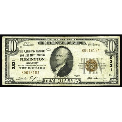 <B>Flemington, NJ</B></I> - $10 1929 Ty. 1 <B>The Flemington NB & TC</B></I> Ch. # 2331<BR>In 1930, Nedonis Sutphin and F.R. Williamson added the trust designation to this bank's title. <B>Very Fine.</B></I>