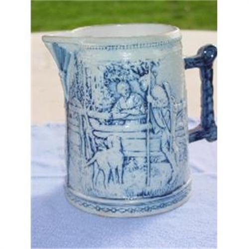 Offered for sale is one of the jugs or pitchers from my Father's collection. Collecting salt-glazed pottery was his passion and he amassed quite a collection. He was a perfectionist and if one jug looked just a little bit better than another for any reason, he would buy it. Thus we have duplicates, and in this case the jug "didn't fit the style of his collection." This is a beautiful old jug made in the 1900's to 1930's era. The mold is very crisp and clean. The cobalt blue is striking. One side of the jug features a man playing a dulcimer or autoharp (?) with two women and a dog watching. In the background you can see the details of hung pots and pans, and a fire as well as the planks of the flooring and side of the building. The other side features a man leaning on a rail fence with walking stick in hand, and talking to a woman. He is accompanied by his dog. Again there is much detail with trees in the background, grass, and even ropes tying parts of the fence together. The top, bottom, and spout of the jug is decorated also. The top of the jug has a beaded pattern around just below the rim, the spout has a fan shape, and the bottom has a diamond and flower pattern. The jug is in very good condition. There are no chips, hairlines, damage to the spout or handle, or repairs. There are two very tiny nicks in the walking stick which does not deter from the beauty of this piece. There are two areas of crazing inside the jug...at the bottom and on one side. Dad said it ...