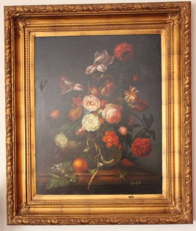 Flemish Signed Large Oil on Canvas Original "Blumen in Einer Vase" in Gilt Frame 40x44"