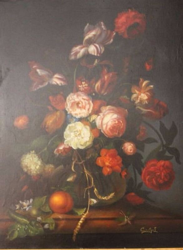 Antique Flemish Oil on Canvas in Gilt Frame. To the best of our knowledge our auction house is of the opinion that this is an original "Blumen in Einer Vase". The art records show paintings selling at auction between 7,000-30,000. Please do your own investigations or consult your art expert. List of possible flowers in the scene: Tulips, roses, lillies and other flowers in a vase on a stone ledge.