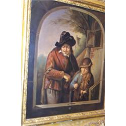 Flemish School - Pair of 19th Century oils on metal panels - Interior scenes with two figures sea...