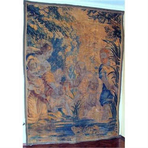 Important REAL XVII th Flemish tapestry , it is a fragment of a bigger one measuring probably 33 feet wide , the complete tapestry would be fantastic. I have seen in several occasions big tapestry been cut in 4 parts, so that they fit better in modern houses . In this fragment of tapestry of the XVII Century, I can see a scene of the old testament , the topic could be ? Moses is abandoned by his mother and siblings Aaron and Miriam in a basket beside the Nile." ( Is NOT John the Baptist).