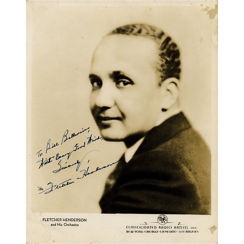 American pianist, bandleader, arranger, and composer (1897–1952) who was important in the development of big band jazz and swing music. He was one of the most prolific black musical arrangers and, along with Duke Ellington, is considered one of the most influential arrangers and bandleaders in jazz history. Scarce vintage glossy 8 x 10 Consolidated Radio Artists publicity photo for Fletcher Henderson and His Orchestra, which shows the bandleader in a side-glancing bust-length pose, signed and inscribed in fountain pen, "To Bill Baldwin, With every good wish, Sincerely, Fletcher Henderson.†In very good to fine condition, with scattered light creasing, and areas of surface loss to the upper and lower right corners.