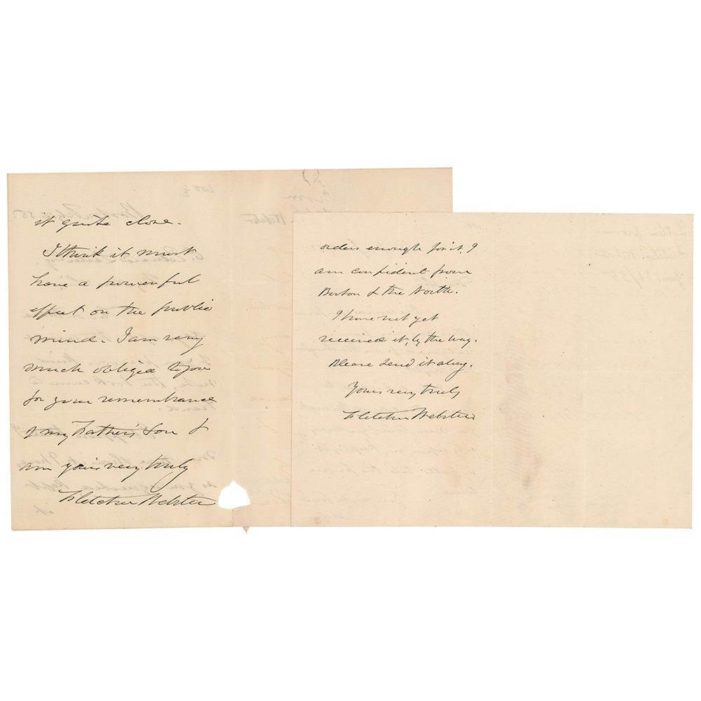 Son of Daniel Webster who served as a Union colonel during the Civil War and was killed in action at the Second Battle of Bull Run (1818–1862). Two ALSs, totaling four pages on two sheets, January 31 and February 13, 1855. The first, in part: "I received your favor this morning, having returned from Washington last night. I shall be glad to receive the copy of the book you mention & you may rely upon my keeping it in petto, till the proper time. You will find orders enough for it, I am confident from Boston & the North." The second, in part: "Two or three days after the receipt of your previous kind note, the book came to hand. I suppose that I may now show it; I have, as you requested, kept it quite close. I think it must have a powerful effect on the public mind." In overall fine condition, with a bit of loss to the edge of the later letter.