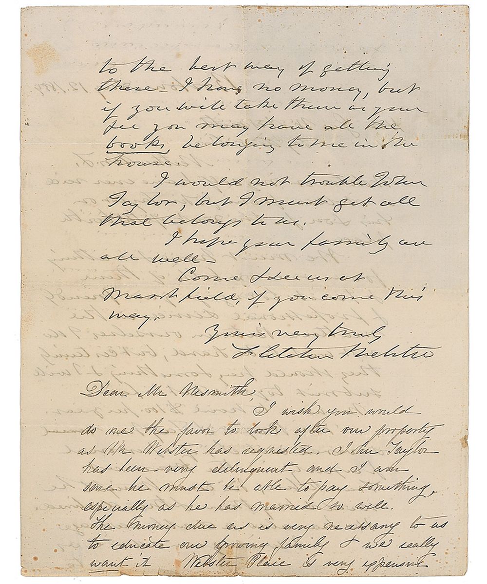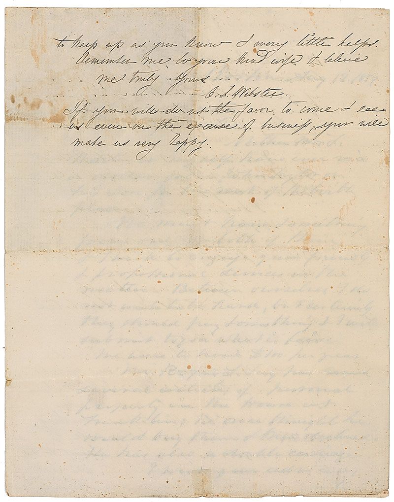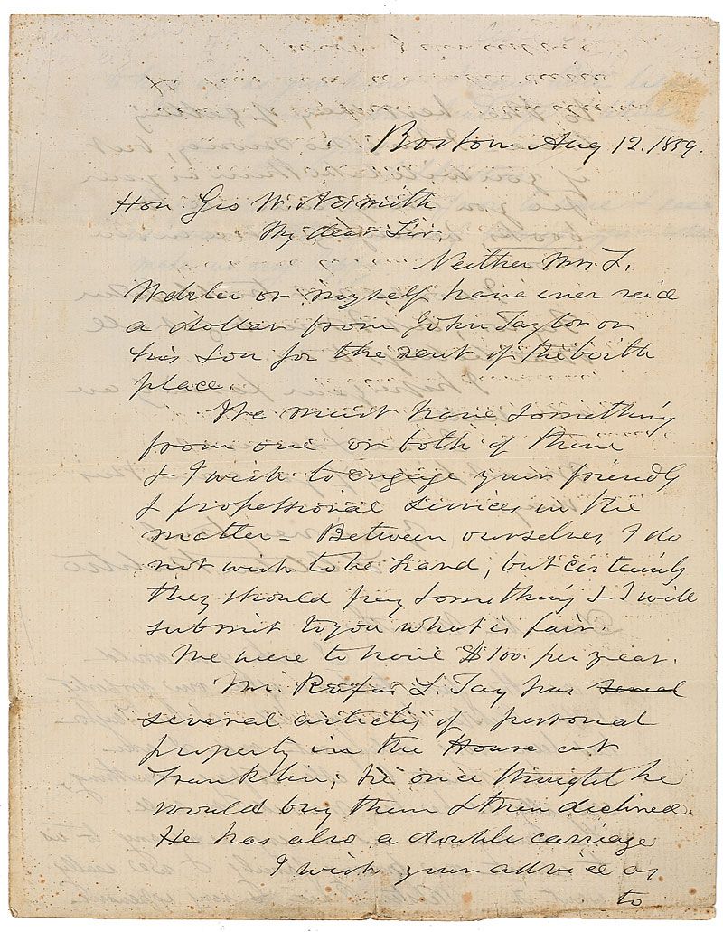 Son of Daniel Webster and Union officer who was killed in action in the Second Battle of Bull Run on August 30, 1862. ALS, one page both sides, 7.5 x 9.75, August 12, 1859. Letter to George Nesmith. In part; “Neither Mrs. L. Webter or myself have ever rec’d a dollar from John Taylor or his son for the rent of the birth place. He must have something for one or both of them & I wish to engage your friendly and professional services in the matter. Between ourselves, I do not wish to be hard, but certainly they should pay something & I will submit to you what is fair. We have to have $100 per year…I have no money, but if you will take them as your fee, you may have all the books belonging to me in the house.” At the conclusion, Caroline LeRoy Webster has added a letter to Nesmith, stating “Webster place is very expensive to keep up as you know.” In very good condition, with intersecting folds, one through a single letter of signature, scattered toning and creasing, and light show-through from writing on opposite side.