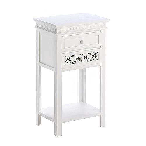 Fleur-De-Lis Side Table **|**|** This lovely side table will bring charm and style to your living room, bedroom, and beyond! Two pullout drawers and a lower display shelf make it a great addition to any room. Item weight: 16.2 lbs. 16-1/4 x 11-7/8" x 28-3/8" high. MDF Wood."