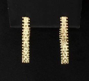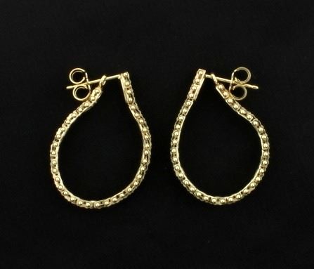 The golden hoop is a flexible link that extends around back of ear and hooks onto post. Has 14K friction backs. They are approximately 1 inch from post to bottom of loop. 5.3g