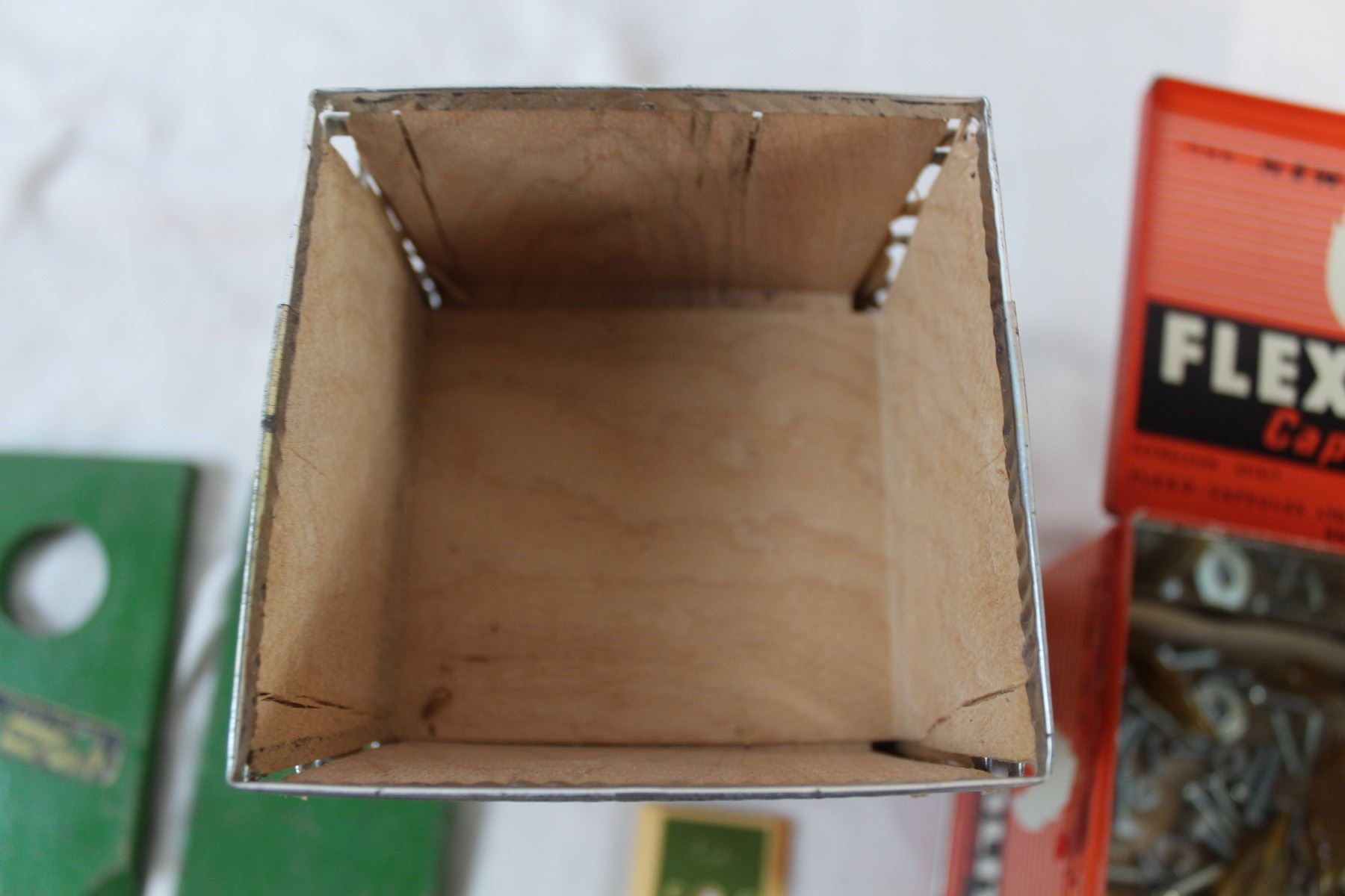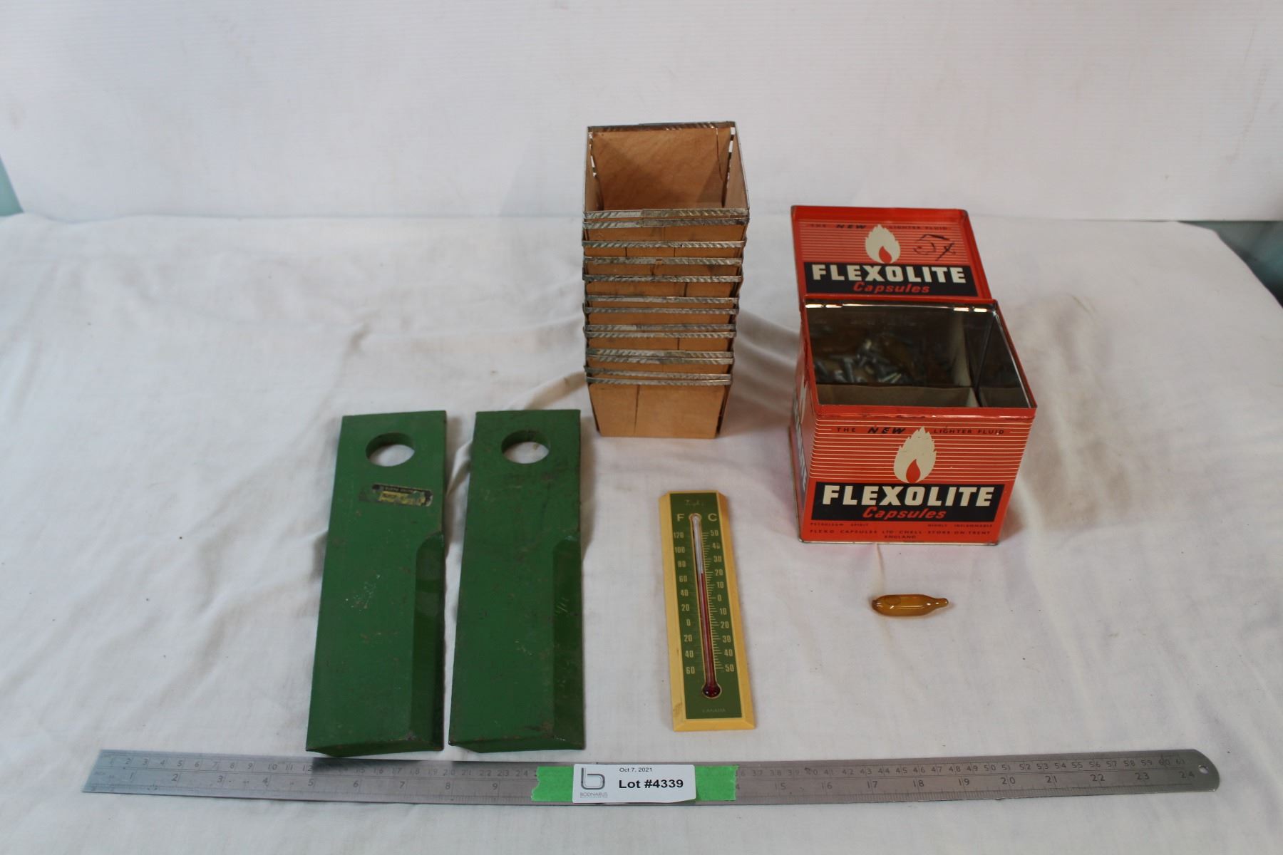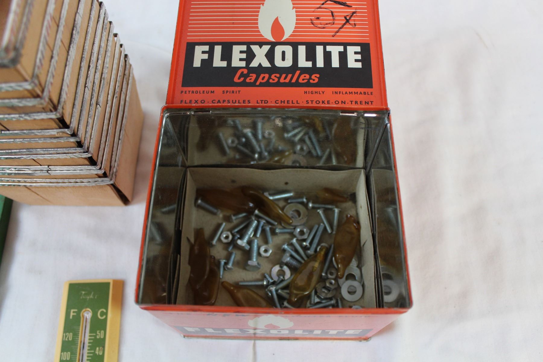Flexolite tin, vintage thermometer, misc