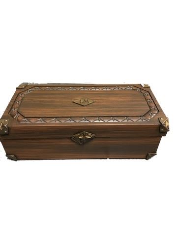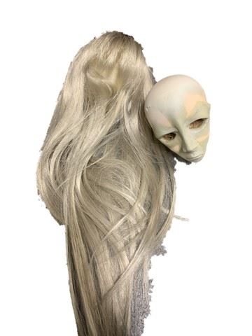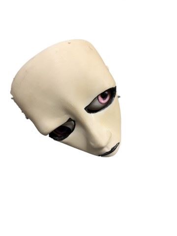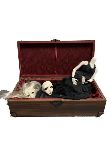 Creepy guy's screen used for sfx, evil doll and wooden box. Wooden box with initials "LM" on the top and red satin interior, resembling a coffin. Doll comes with an open head and moveable eyes, wig and head are detached from the body. Comes with additional head painted for sfx purposes.