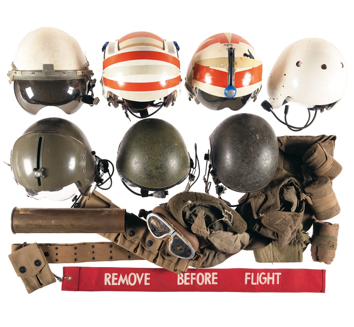8 flight helmets, 2 pairs of goggles, remove before flight streamer, artillery shell casing marked "Rheims July 15 to 21-1918 Fourth French Army", 2 field caps, 1918 dated Mills double magazine pouch, web belt, lanyard, bandolier, Mills cartridge belt, 1942 U.S. trench shovel web belt attachment, helmet net, 2 camouflage helmet covers, helmet cover, 4 puttees, unmarked pouch. Overall in good condition.