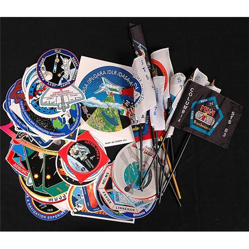 <Our item number 137851><B>Flight & Mission Decals Galore.</B> A carton filled with a wide range of flight and mission decals, many of which we have not seen before. Among the more unusual we note are Kentucky Fried Chicken "Chix in Space" decals, matching "Snoopy, Manned Spacecraft Center decals specifically marked for Apollo 16 (Mattingly), Apollo 17 (Cernan, Evans, Schmitt), SL-1 (Conrad, Weitz, Kerwin, also Schweickart, McCandless, Musgrave), SL-2 (Bean, Lousma, Garriott) and SL-3 (Carr, Pogue, Gibson) and a similar, but different Snoopy patch for Alan Shepard (Apollo 14?). We also note metal lapel pins, desktop flags, buttons and other esoteric memorabilia. What this lot doesn't have in individual value, it more than makes up for in diversity and interest. Excellent condition and well worth a close look. <BR>Estimated Value $250 - 350. <BR><BR>Our item number 137851<BR><IMAGES><P ALIGN="CENTER"><IMG SRC="http://www.goldbergcoins.net/live auction/49jpegs/137851.jpg"> </P></IMAGES>