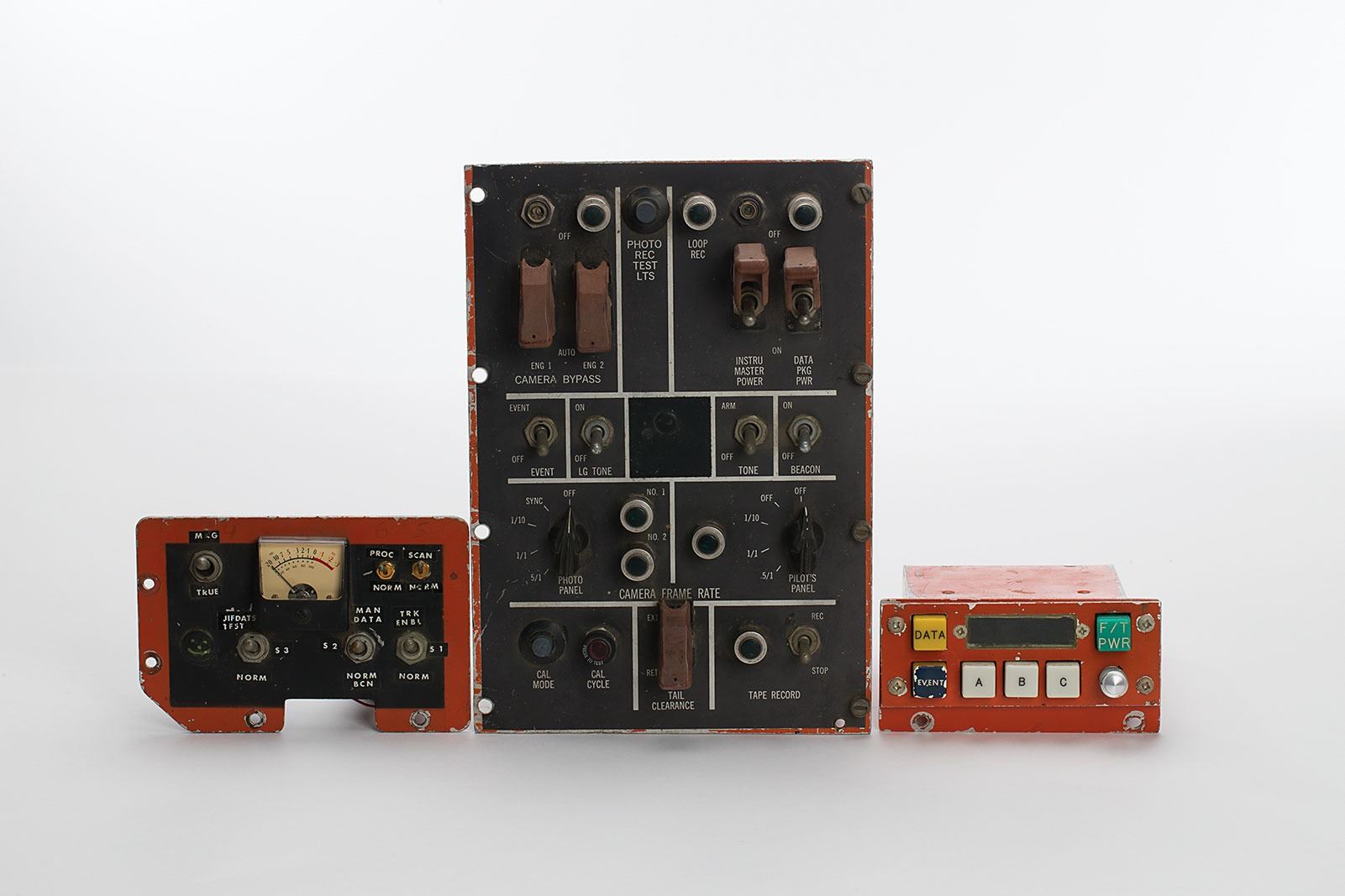 Group of three pieces of flight test program instrumentation involved in a photo reconnaissance program (possibly SR-71), believed to have originated from Edwards Air Force Base, including: a camera control unit, measuring 7.5? x 11? x 5?, with controls for power, camera bypass, frame rate, and other functions; a module with a digital display, measuring 5.25? x 2.5? x 5.5?, with buttons marked "Data," "Event," "F/T Power," and "A," "B," and "C"; and an analog meter panel, measuring 6.5? x 4.25? x 2?, with the gauge identified as "JIFDATS Test," and various toggle switches. In overall very good to fine condition.