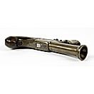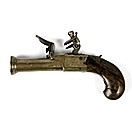 Flint Box Lock Blunderbuss Pistol, 7/8" bore diameter at flared muzzle, 2.75" brass barrel. The sides of the frame feature sunburst engravings, with engraved borders. The box lock has a safety mechanism, and the trigger folds down from theframe at full cock. One piece walnut grip. The brass has a nice patina throughout. The grip appears to be missing a small pin. Functions mechanically. Est:$300-500