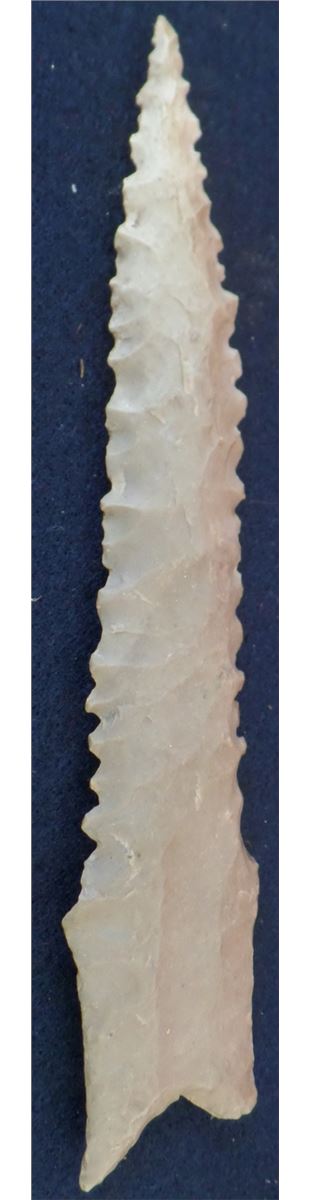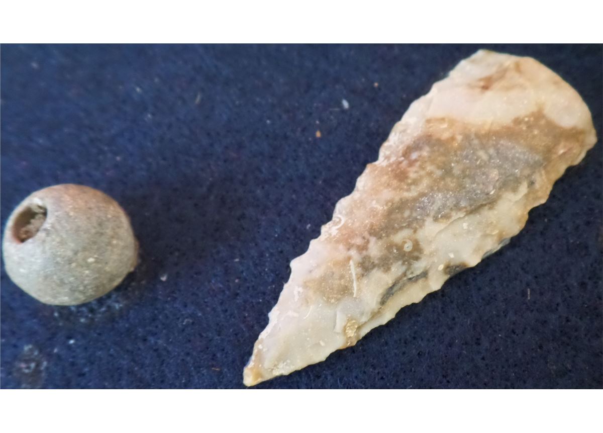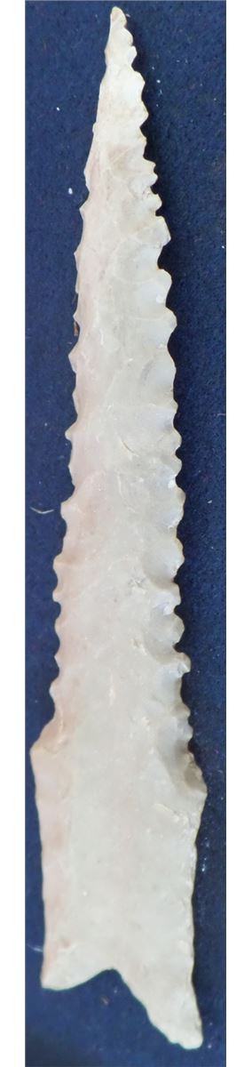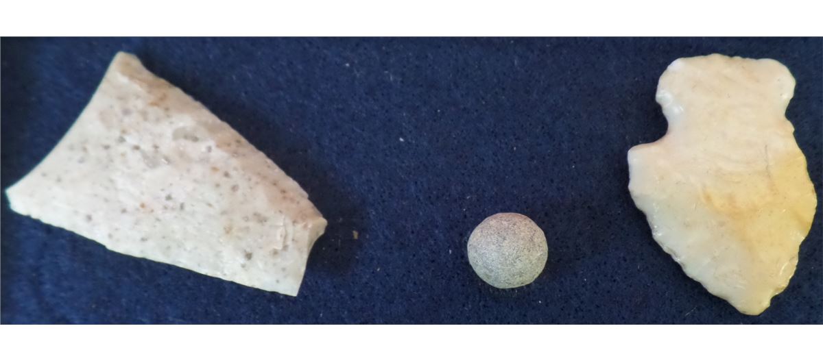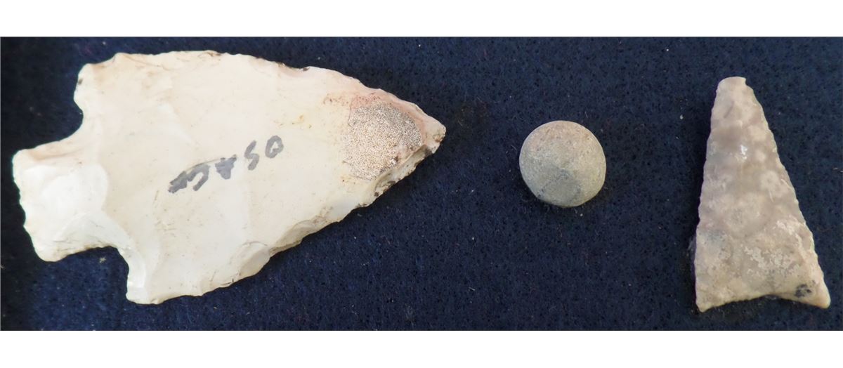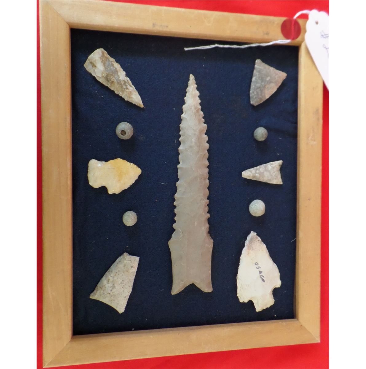 Flint Collection including Dalton from Missouri. Items measure from 1/2 to 7 1/2 inches. There are lead bullets, chert points and lead miniballs. The condition is as found. Frame is included. Shipping $25.00