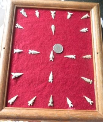 Frame with 21 fine bird points from Missouri measuring approximately one inch long. Condition is perfect. Shipping $15.00