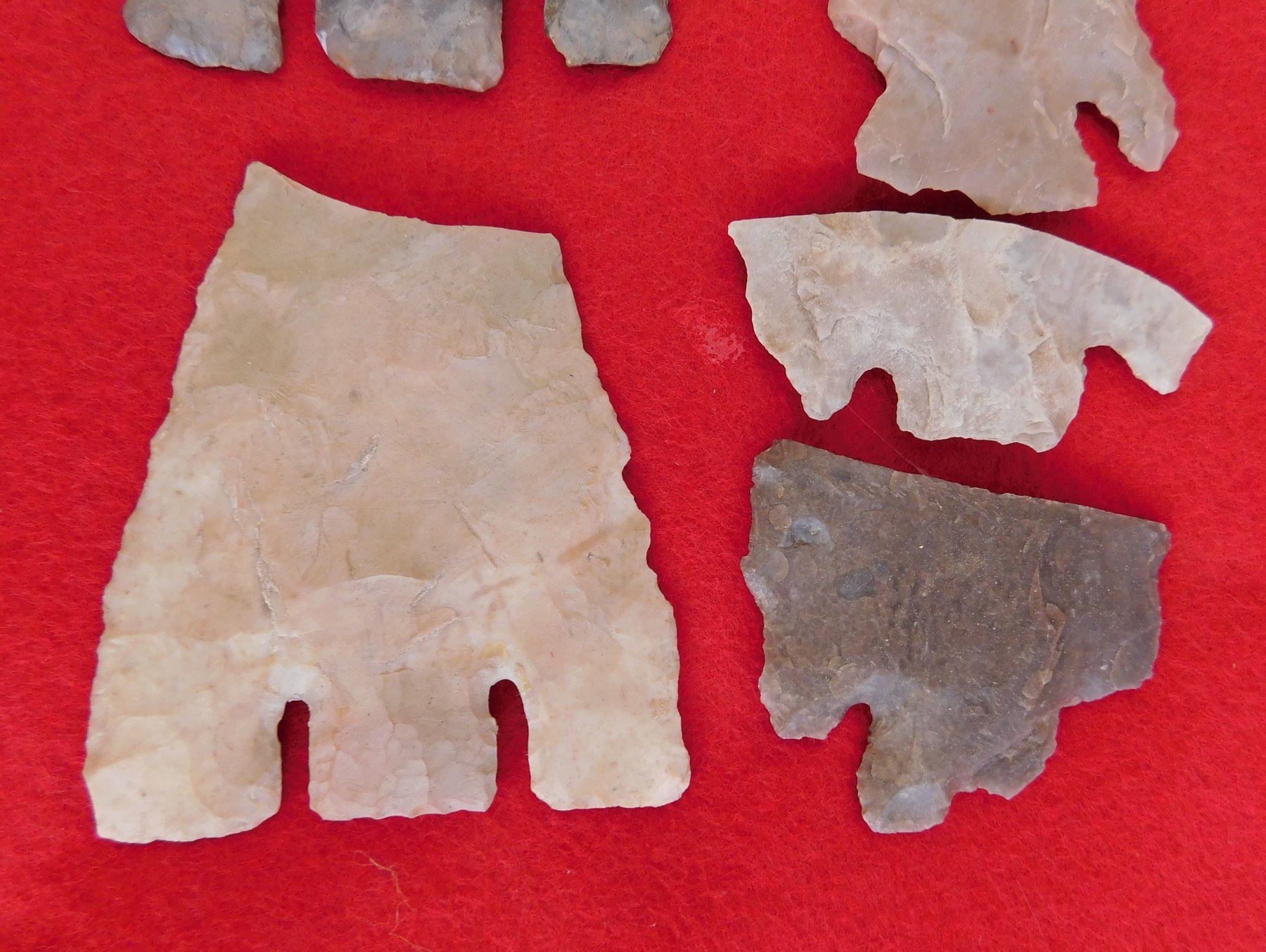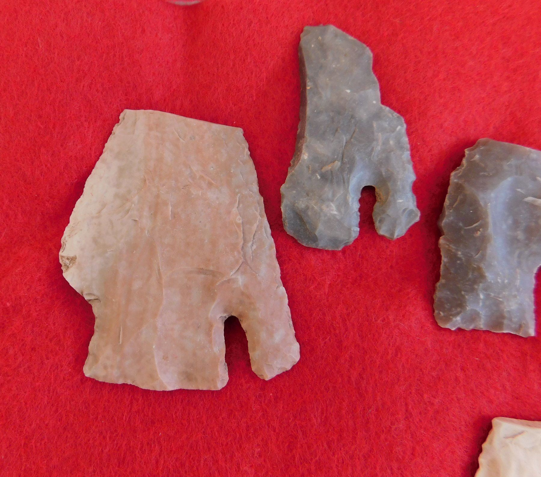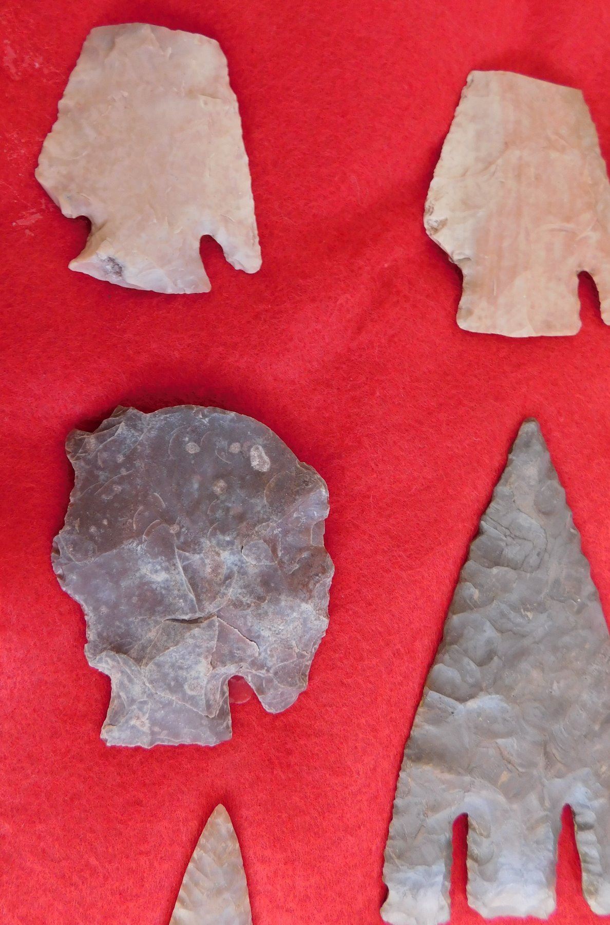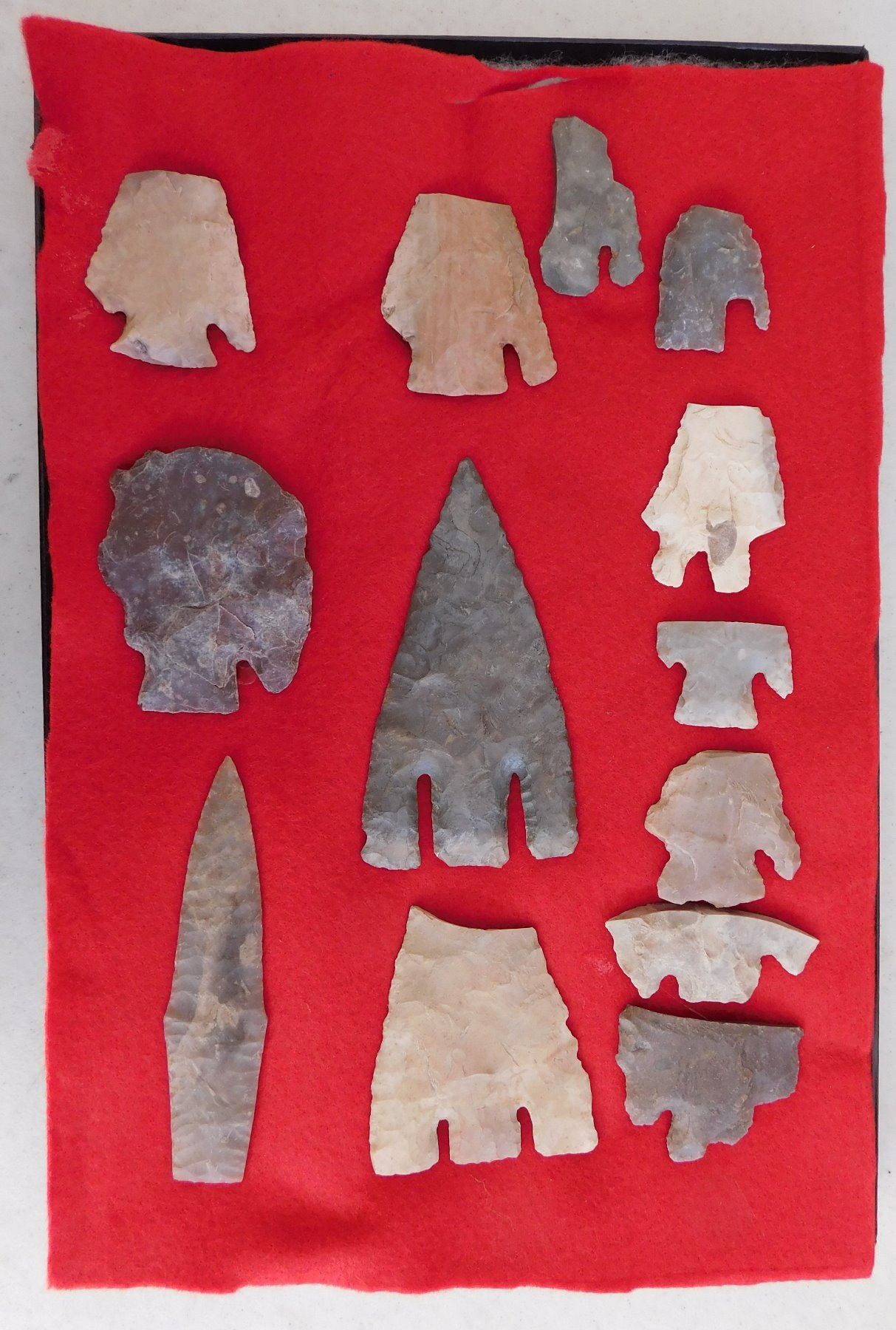 Flint Collection, pre-historic items. Made of chert, the longest point measures 4". Bell County, Texas. Fine Andice. Frame not included. Condition: Most are damaged, see images. Shipping: $25.00 w/insurance and signature, due to value.