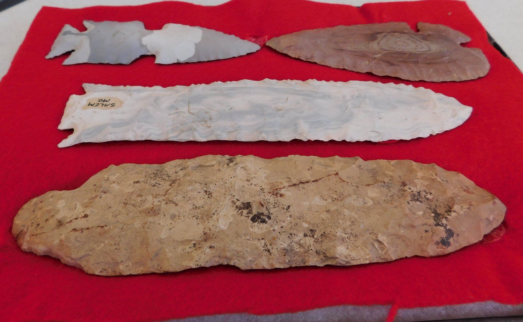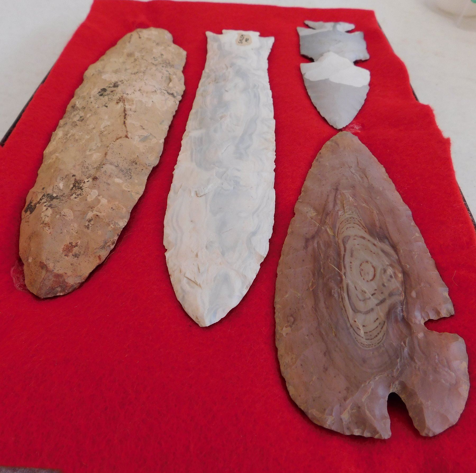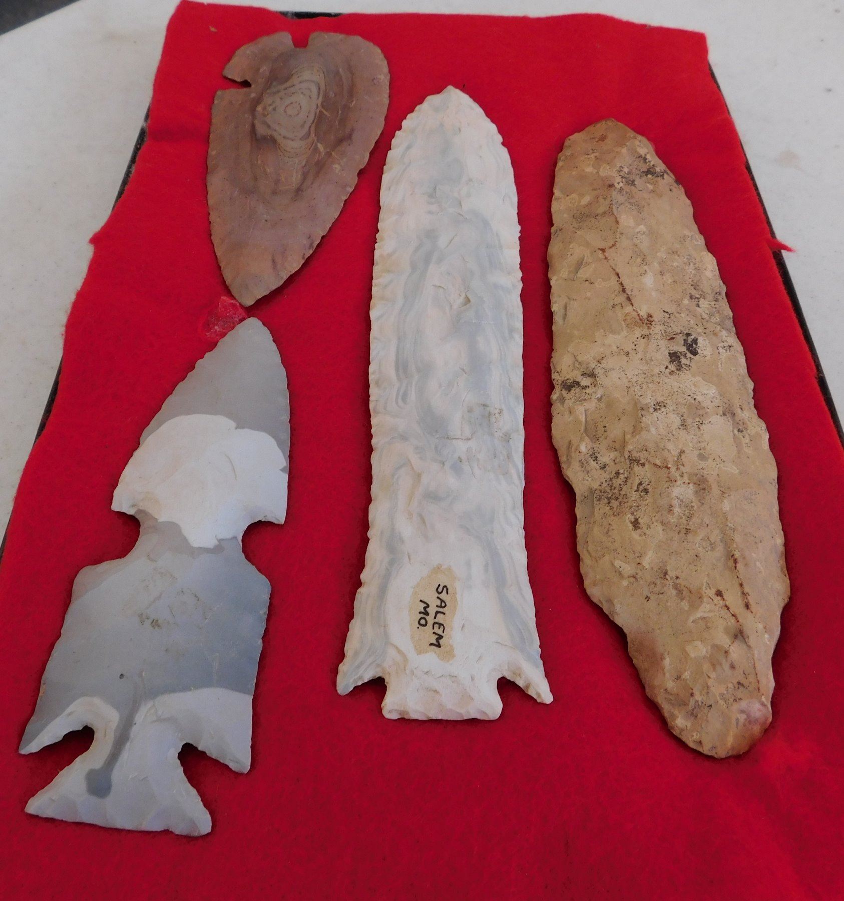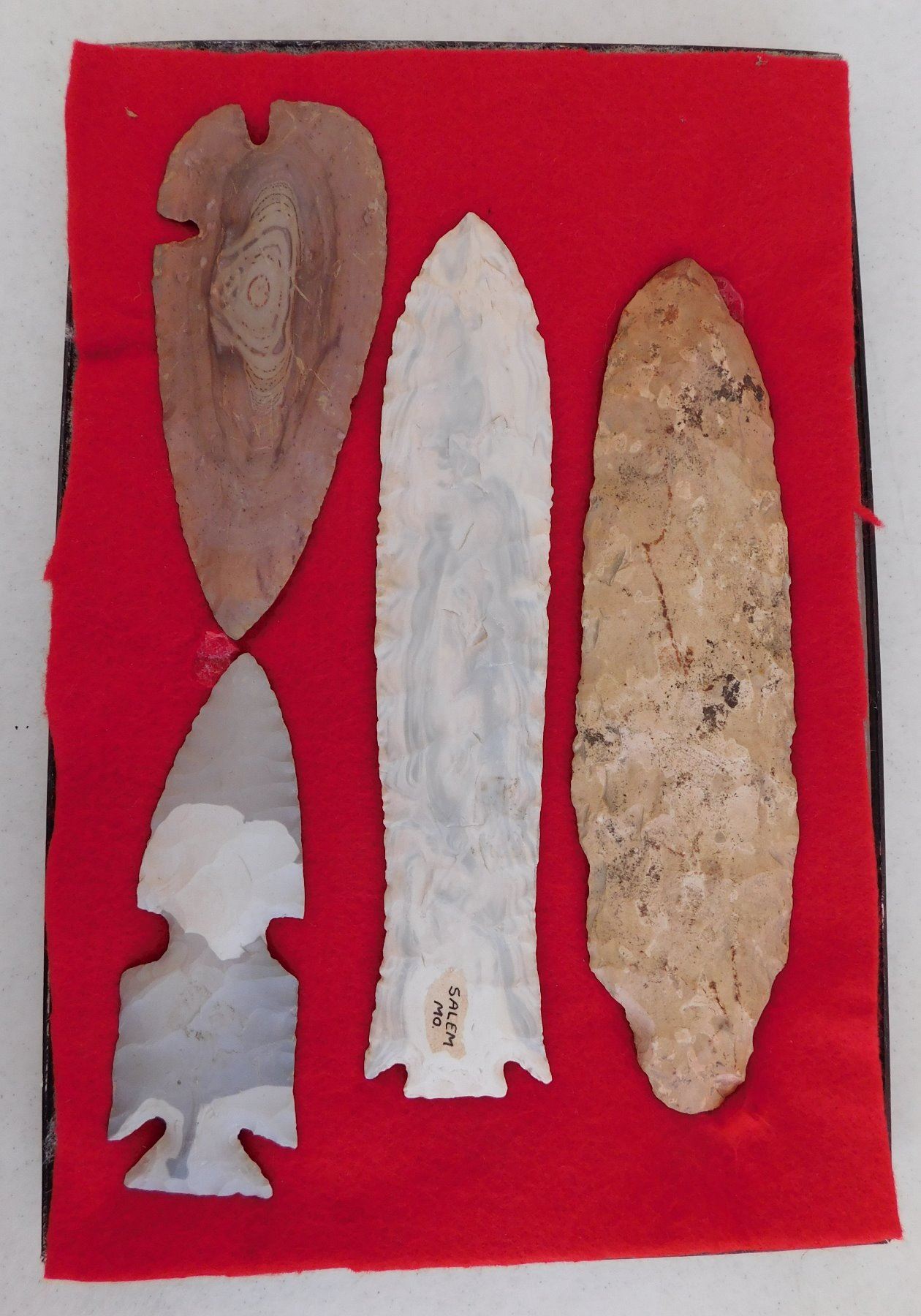 Flint Collection, pre-historic items. Made of chert, the longest measures 8 1/2" long. Central Missouri. Unusual blue and white chert. Frame not included. Condition: Adena has heavy wear, see images. Shipping: $25.00 w/insurance and signature.