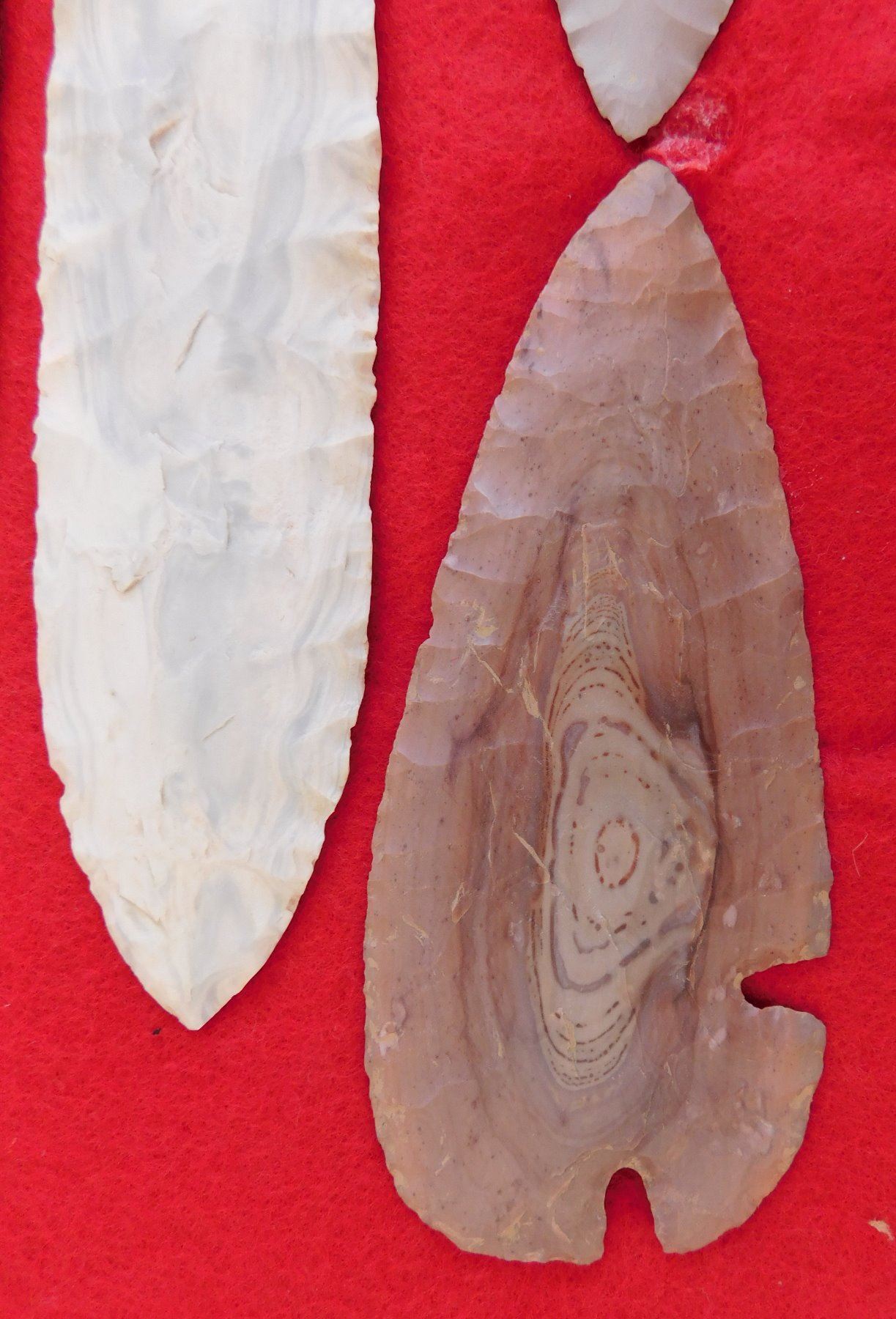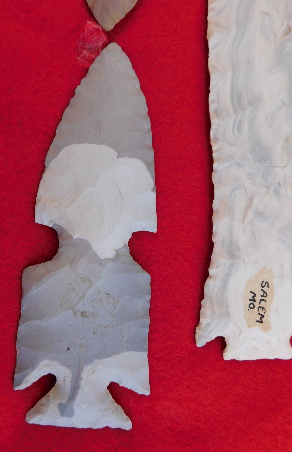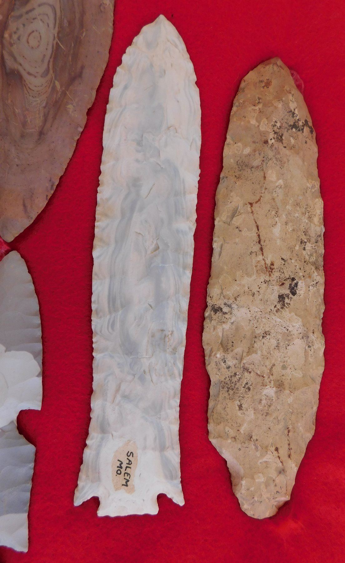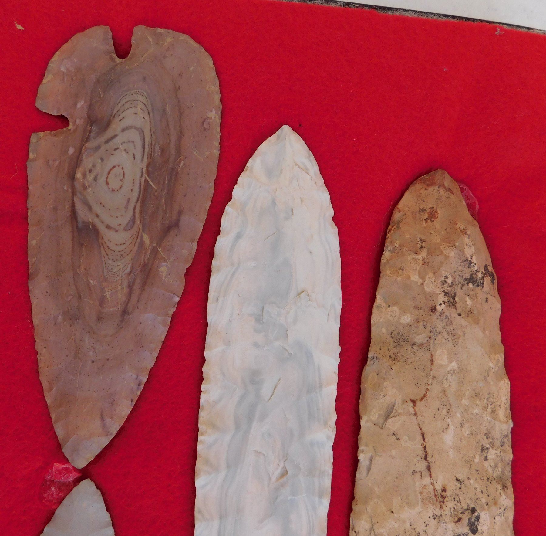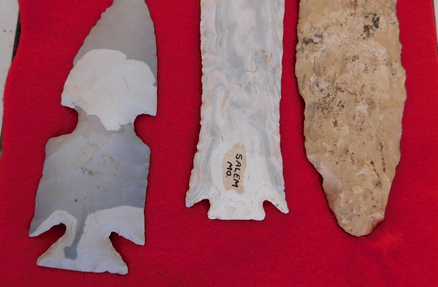 Flint Collection, pre-historic items. Made of chert, the longest measures 8 1/2" long. Central Missouri. Unusual blue and white chert. Frame not included. Condition: Adena has heavy wear, see images. Shipping: $25.00 w/insurance and signature.