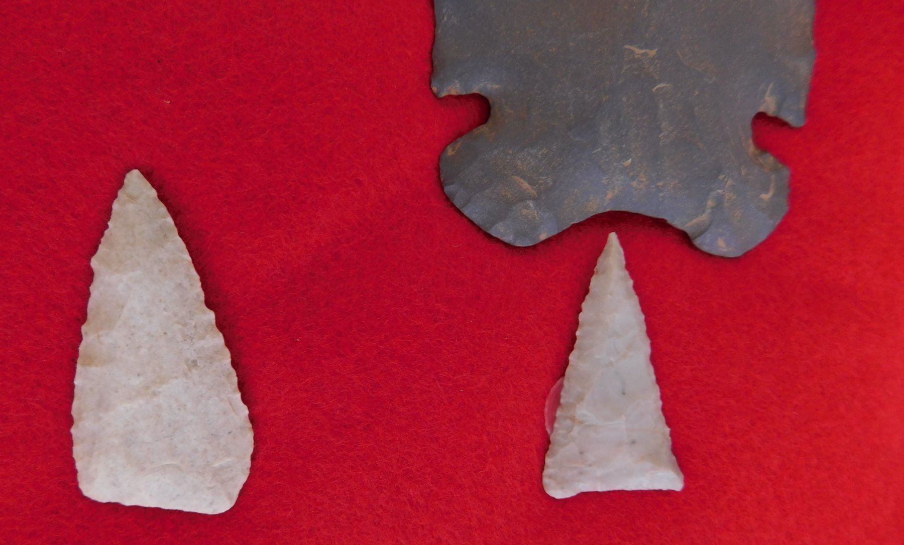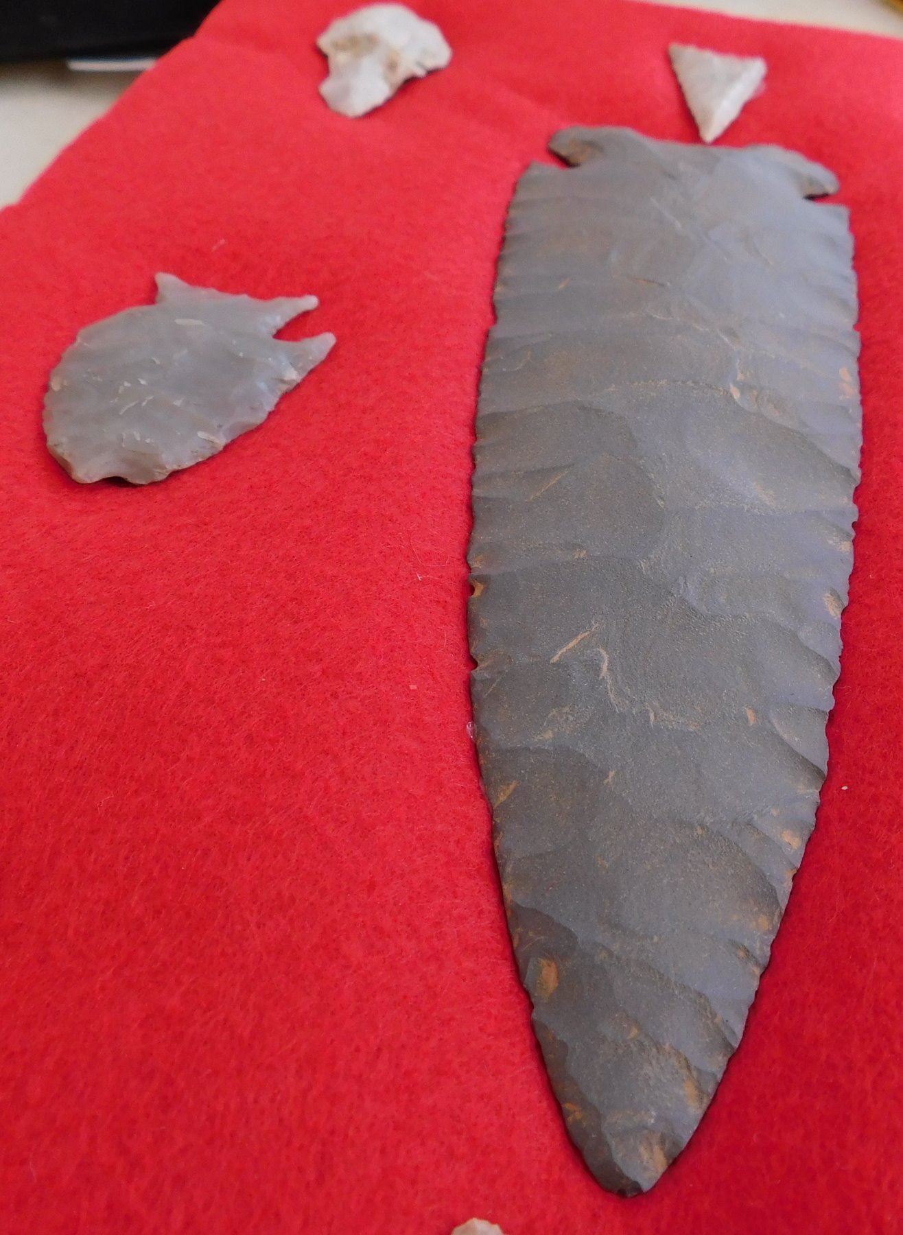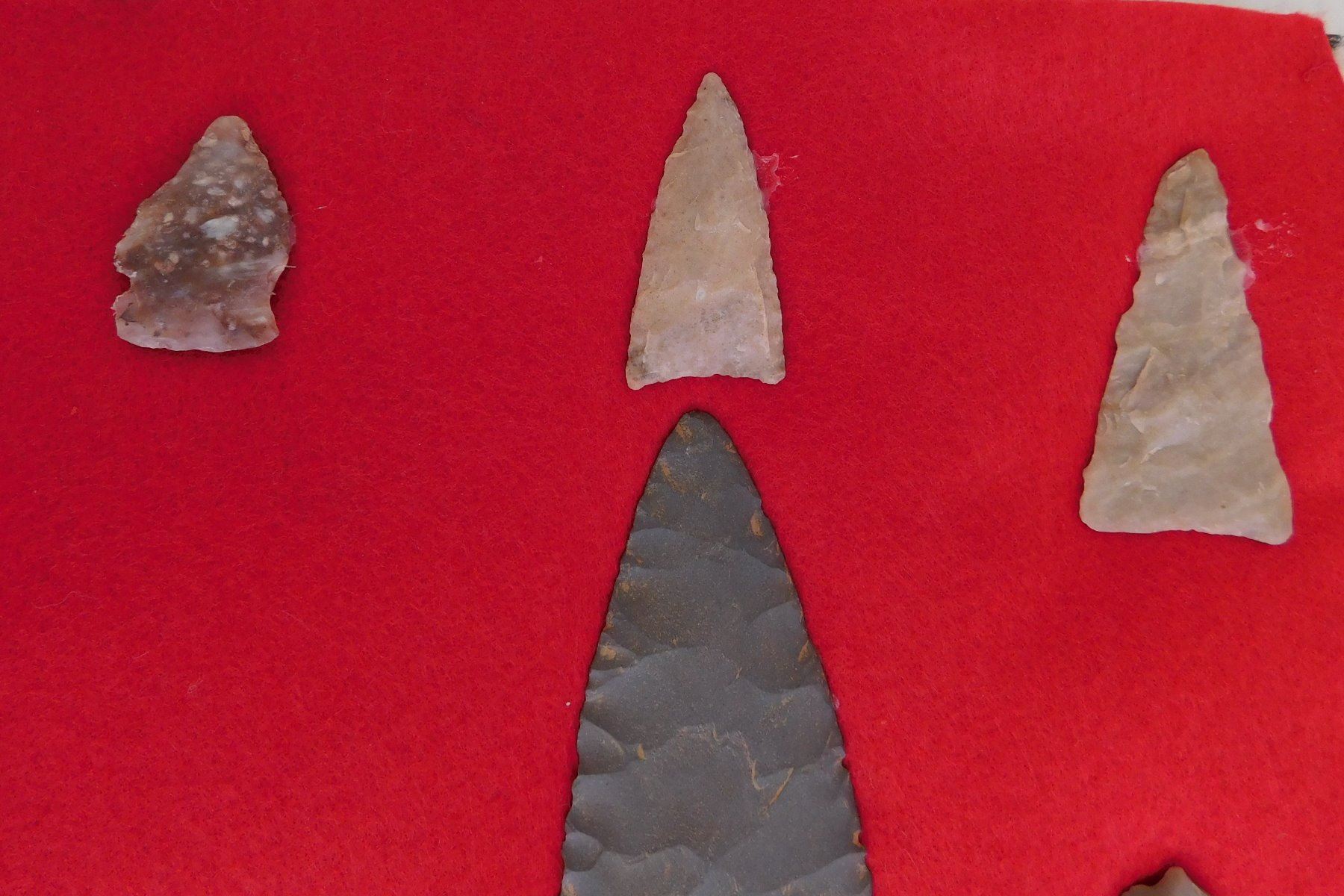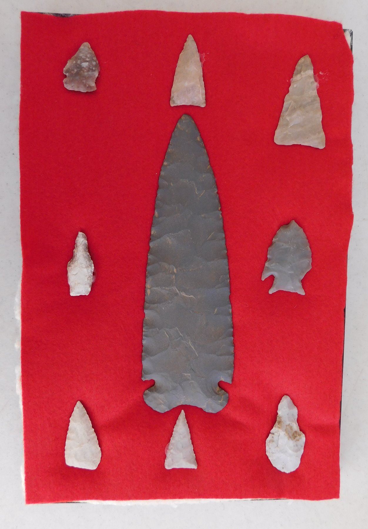 Flint Collection, pre-historic items. Made of flint and chert, the longest point measures 7". Le Flore County, Oklahoma. Frame not included. Condition: Some points have damage, see images. Shipping: $25.00 w/insurance and signature, due to value.